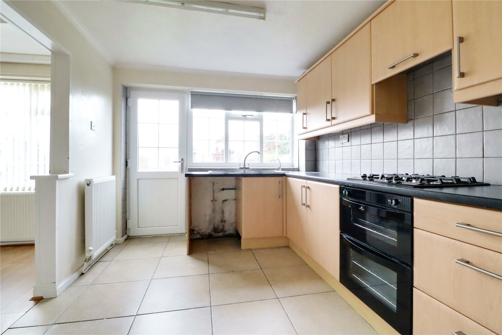 Modern Fitted Kitchen 8'9" x 10' (2.67m x 3.05m). Rear uPVC double glazed window and matching entrance door leading to the garden. The kitchen enjoys a range of wooden style furniture with brushed aluminium style pull handles with a complementary patterned worktop with tiled splash backs incorporating a one and a half bowl sink unit with drainer to the side and block mixer tap, built-in four ring gas hob with double oven beneath and overhead extractor, tiled flooring, plumbing and space for appliances and wall to ceiling coving.