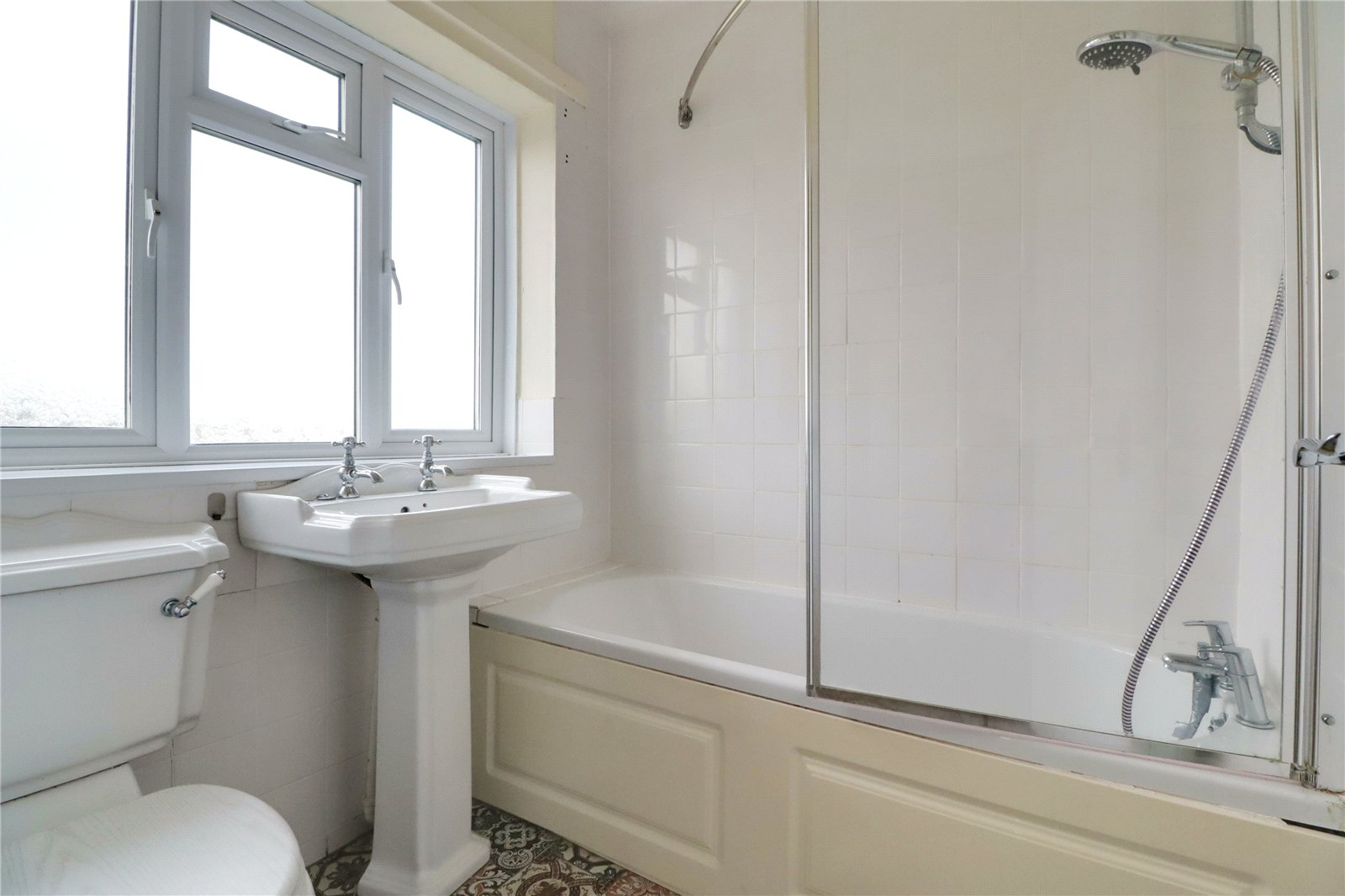 Family Bathroom 6'1" x 5'11" (1.85m x 1.8m). With front uPVC double glazed window with patterned glazing providing a traditional suite in white comprising low flush WC, pedestal wash hand basin and panelled bath with shower attachments and glazed screen, tiled flooring and part tiling to walls.