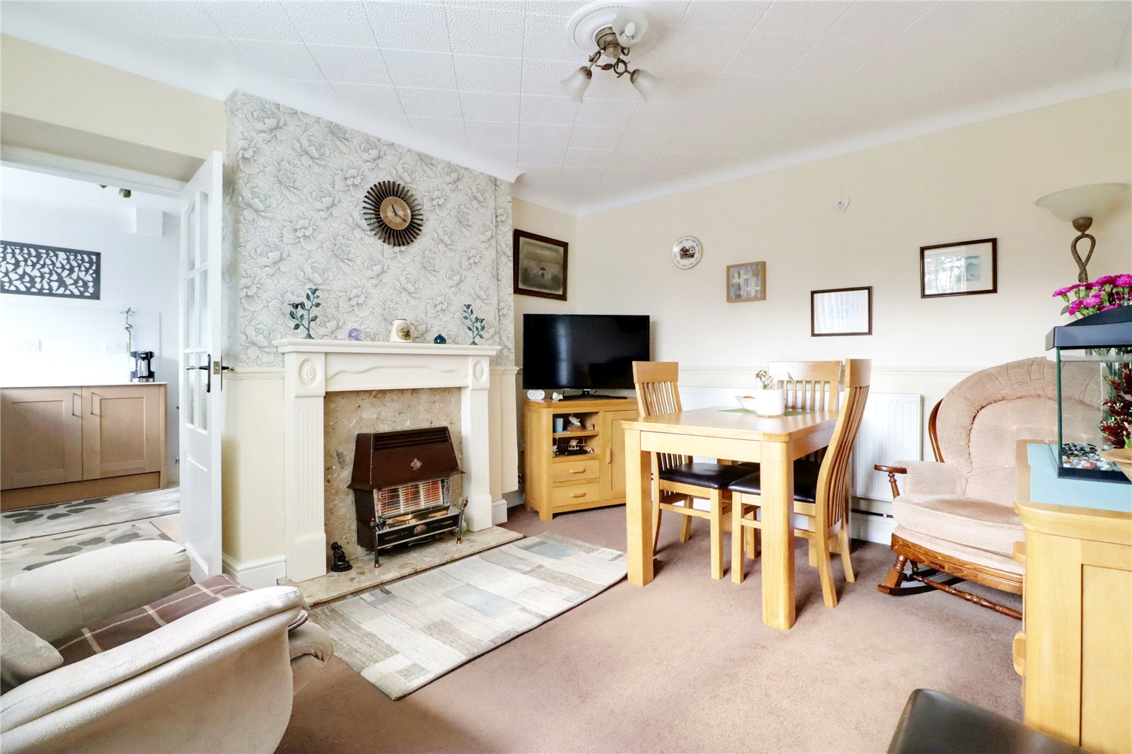Sitting/Dining Room 12'6" x 11' (3.8m x 3.35m). Side uPVC double glazed window, open fronted gas fire with marble backing hearth and decorative surround and mantel, dado railing, wall to ceiling coving, TV point and internal panelled and glazed doors leads through to;