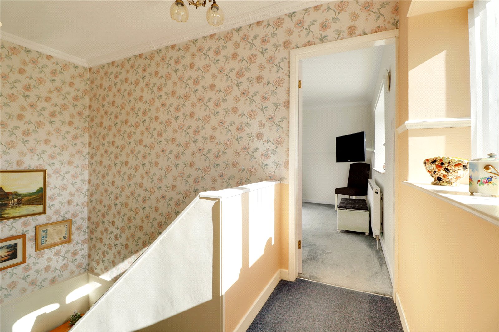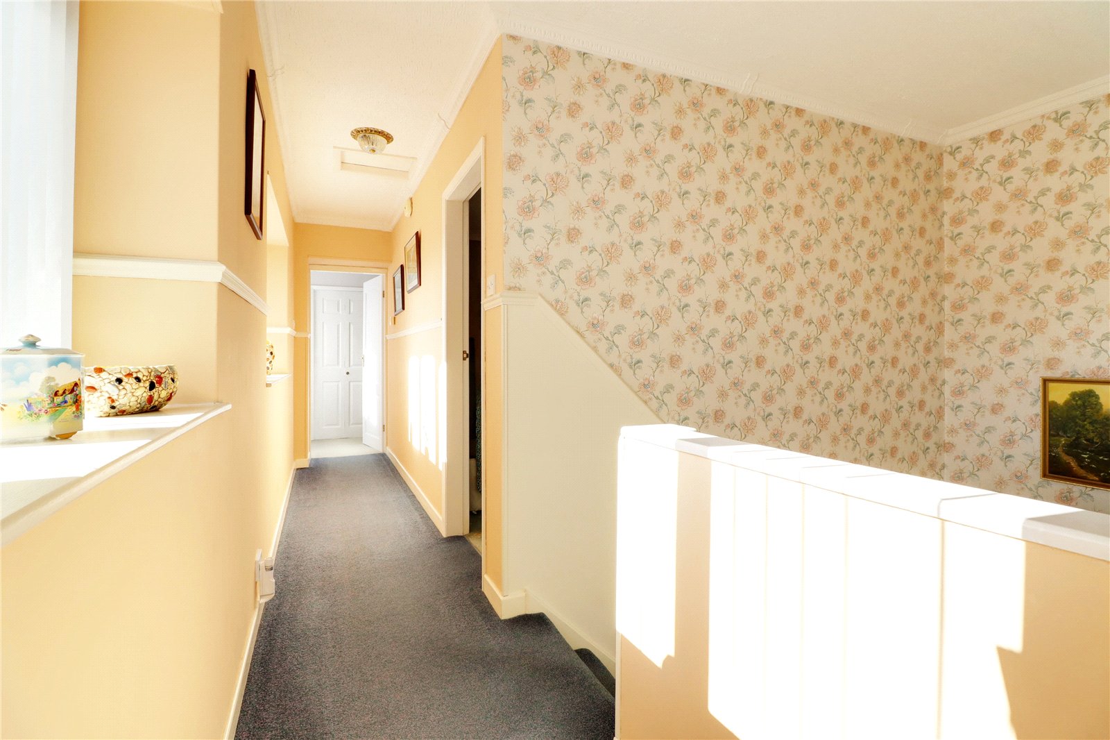 First Floor Landing 12'6" x 5'11" (3.8m x 1.8m). Two side uPVC double glazed windows, dado railing, wall to ceiling coving and loft access.