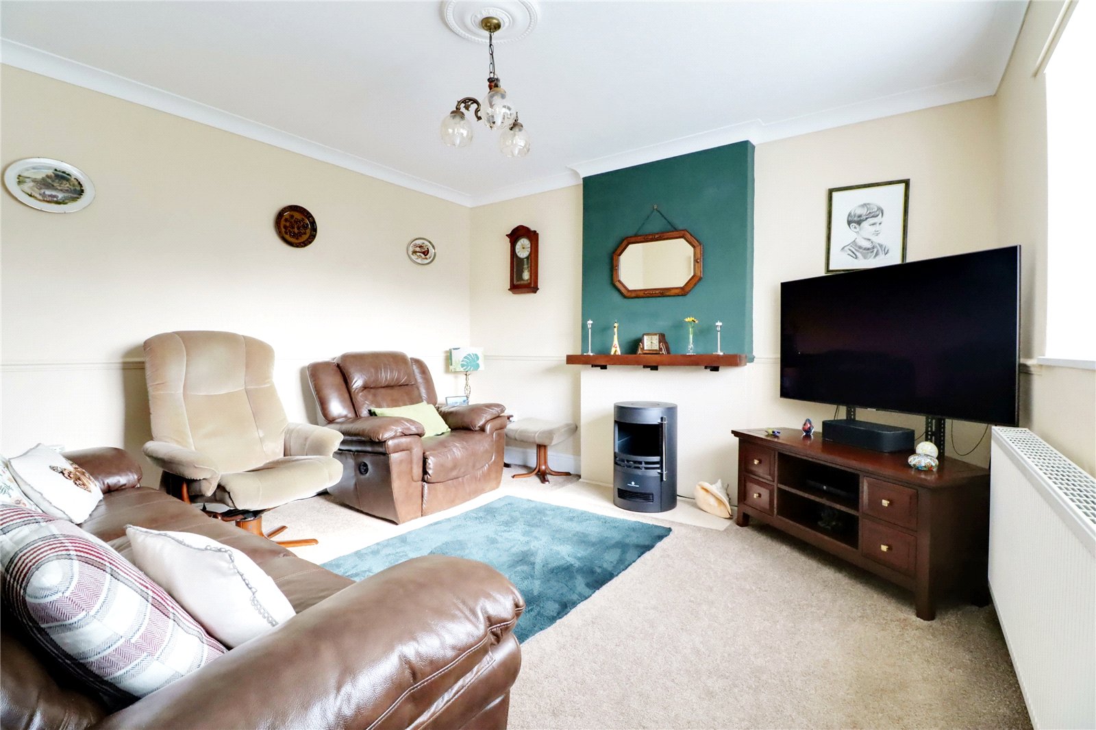 Front Living Room 12'6" x 12'3" (3.8m x 3.73m). Side uPVC double glazed window, TV point, dado railing, wall to ceiling coving and ceiling rose.