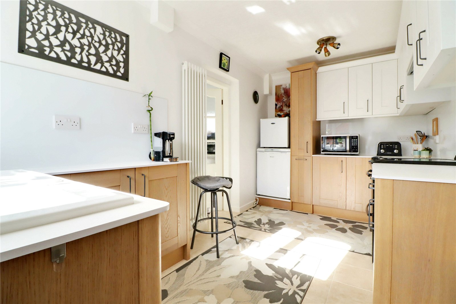 Attractive Fitted Kitchen 13'9" x 7'7" (4.2m x 2.3m). Side composite double glazed entrance door and side uPVC double glazed window. The kitchen enjoys an extensive range of bespoke fitted oak furniture of a shaker style with a complementary worktop with gloss splash backs and incorporates a one and a half bowl ceramic sink unit with drainer to the side and block mixer tap, space for a cooker with overhead built-in AUG extractor, tiled flooring, modern fitted radiator, wall to ceiling coving and doors through to;