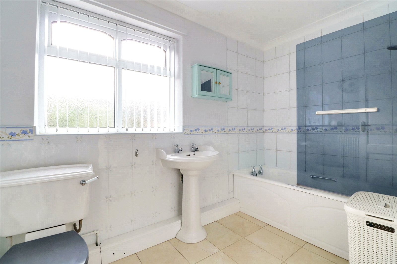 Ground Floor Bathroom 5'6" x 9'10" (1.68m x 3m). With side uPVC double glazed window with patterned glazing providing a traditional three piece suite in white comprising a low flush WC, heritage pedestal wash hand basin, cast iron bath with overhead electric shower and glazed screen, tiled flooring, part tiling to walls and wall to ceiling coving.