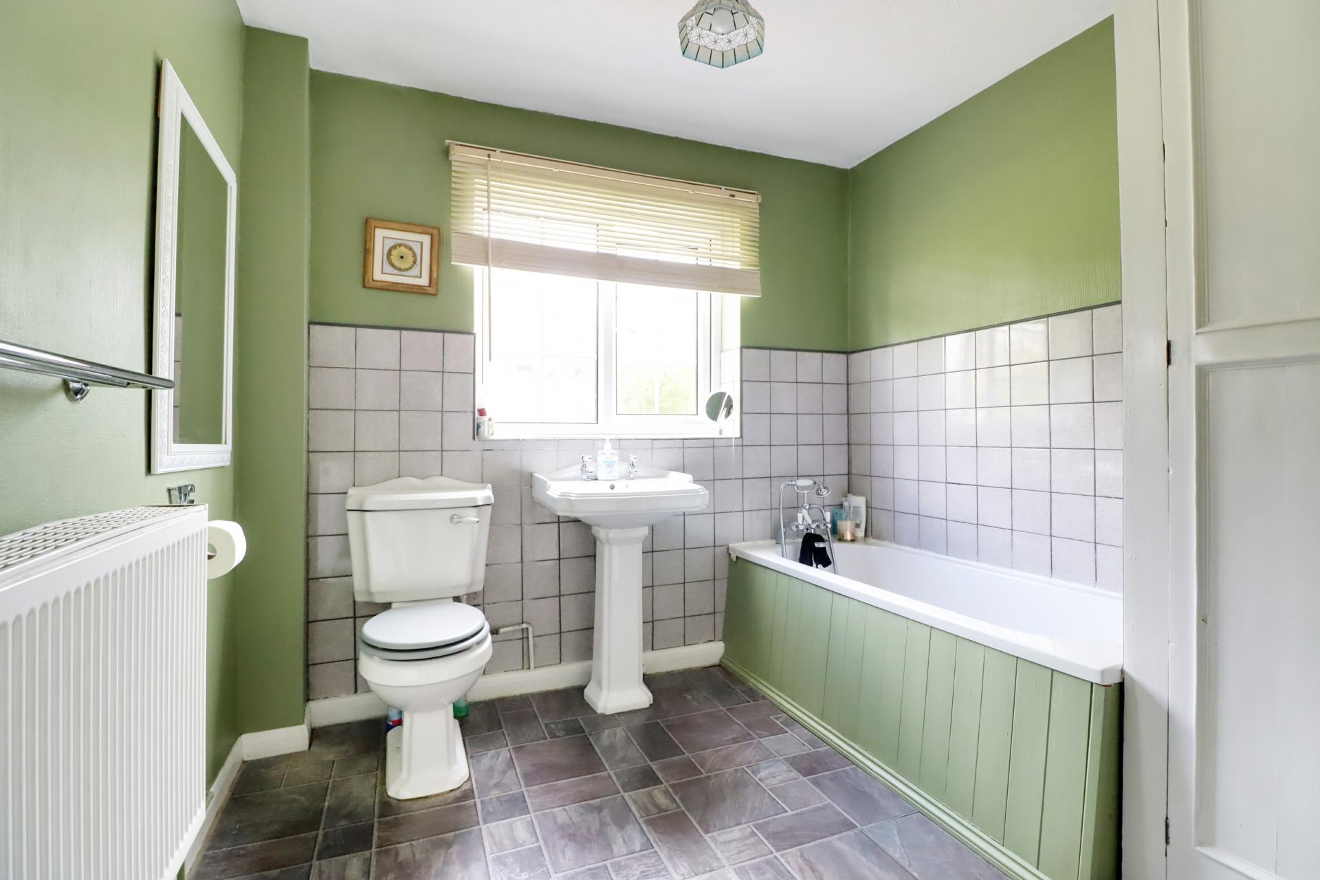 GROUND FLOOR BATHROOM 8'4" x 9'1" (2.54m x 2.77m). With a rear uPVC double glazed window with inset patterned glazing, a three piece suite in white comprising a low flush WC, pedestal wash hand basin, panelled bath with shower attachment, part tiling to walls, slate effect flooring and built-in airing cupboard with fitted shelving.