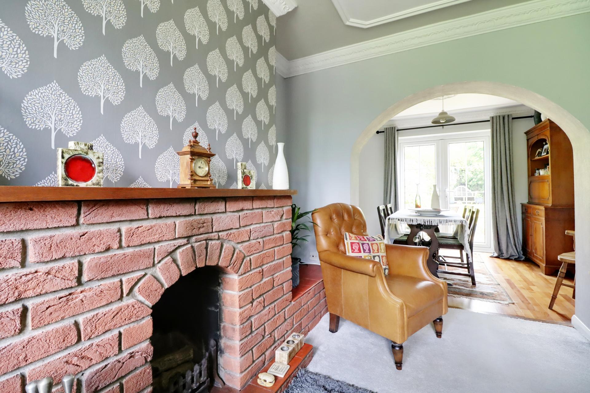 MAIN LIVING ROOM 20'5" x 10'11" (6.22m x 3.33m). With a front uPVC double glazed window, TV point, decorative wall to ceiling coving with matching ceiling rose, a feature brick built fireplace with recessed open fireplace with cast iron grate and tiled hearth, polish wooden mantel and a plinth to either side and an open archway leads through to;