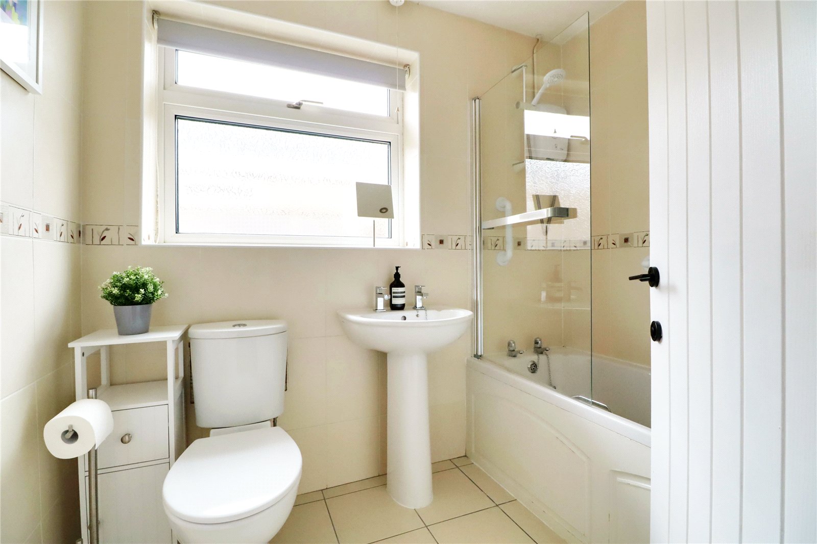 Bathroom 5'6" x 7'8" (1.68m x 2.34m). Side uPVC double glazed window with patterned glazing providing a two piece suite in white comprising a low flush WC, pedestal wash hand basin, panelled bath with electric shower over and glazed screen, tiled flooring, fully tiled walls and fitted chrome towel rail.