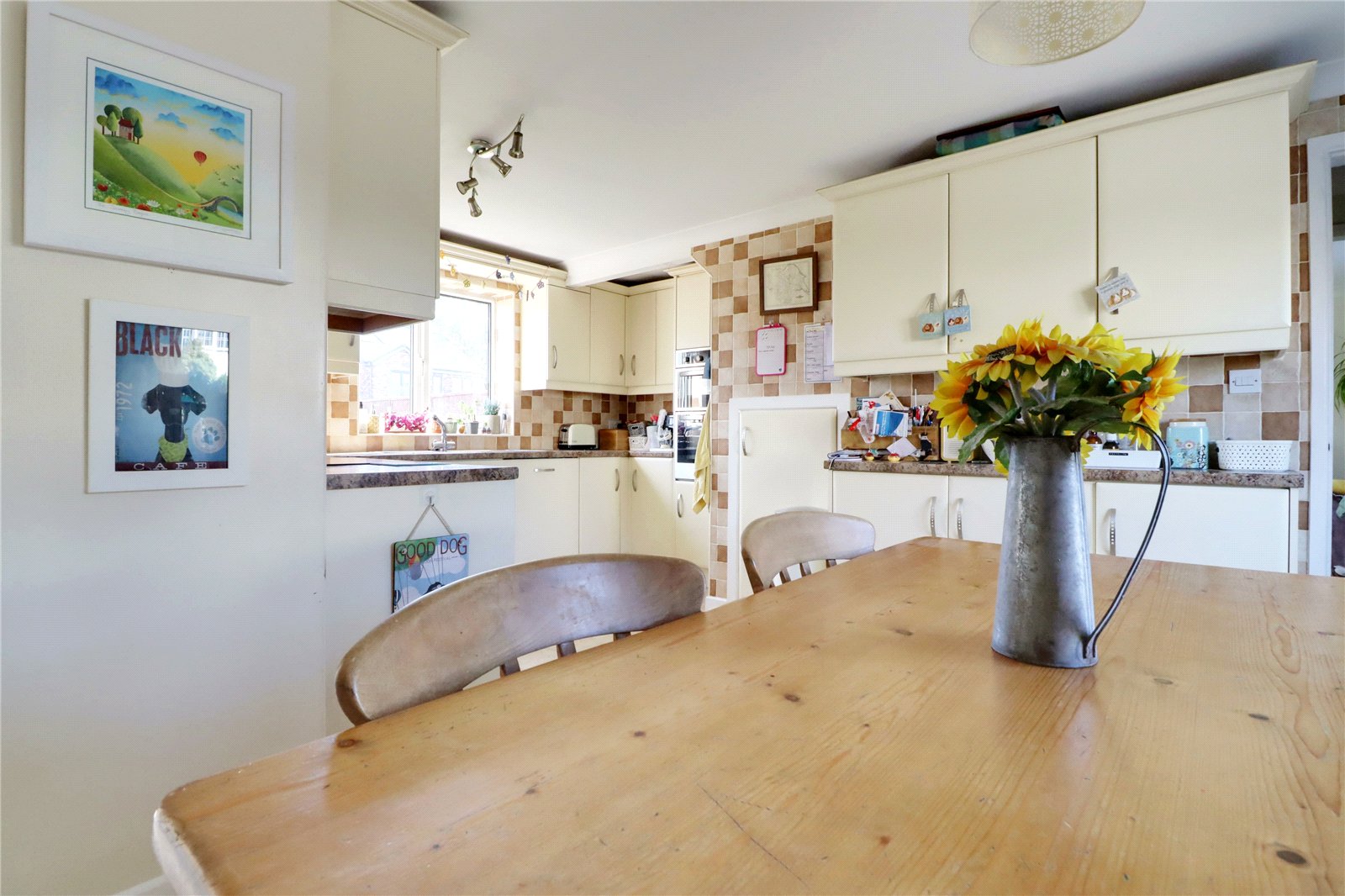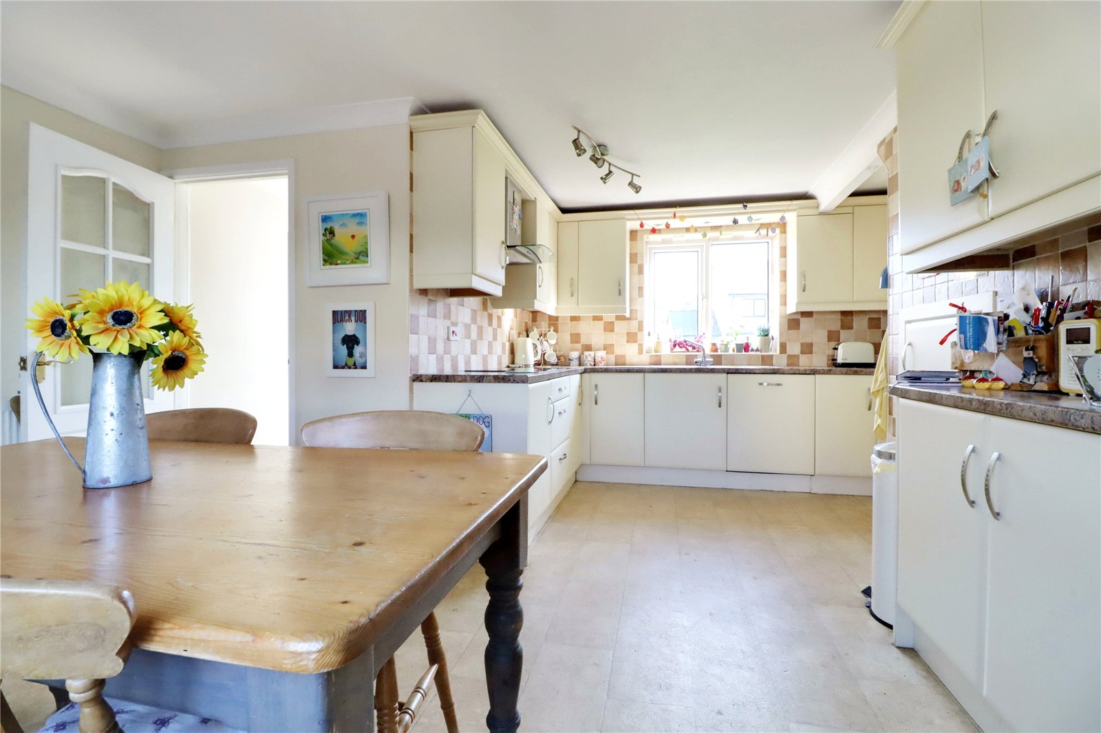 Impressive Open Plan Dining Kitchen 15'8" x 16'5" (4.78m x 5m). Has a dual aspect with front and rear uPVC double glazed windows and front uPVC entrance door. The kitchen enjoys an extensive range of bevelled edge style fitted furniture finished in an Old English White with a complementary patterned worktop with tiled splash backs incorporating a single stainless steel sink unit with drainer to the side and block mixer tap, built-in eye level double oven, tiled effect flooring, wall to ceiling coving and glaze door leads through to;