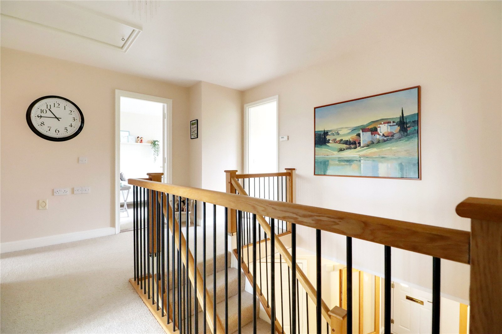 First Floor Central Landing 12'10" x 11' (3.9m x 3.35m). Continuation of open spell balustrading and oak handrails, loft access with a drop down ladder and doors off to;