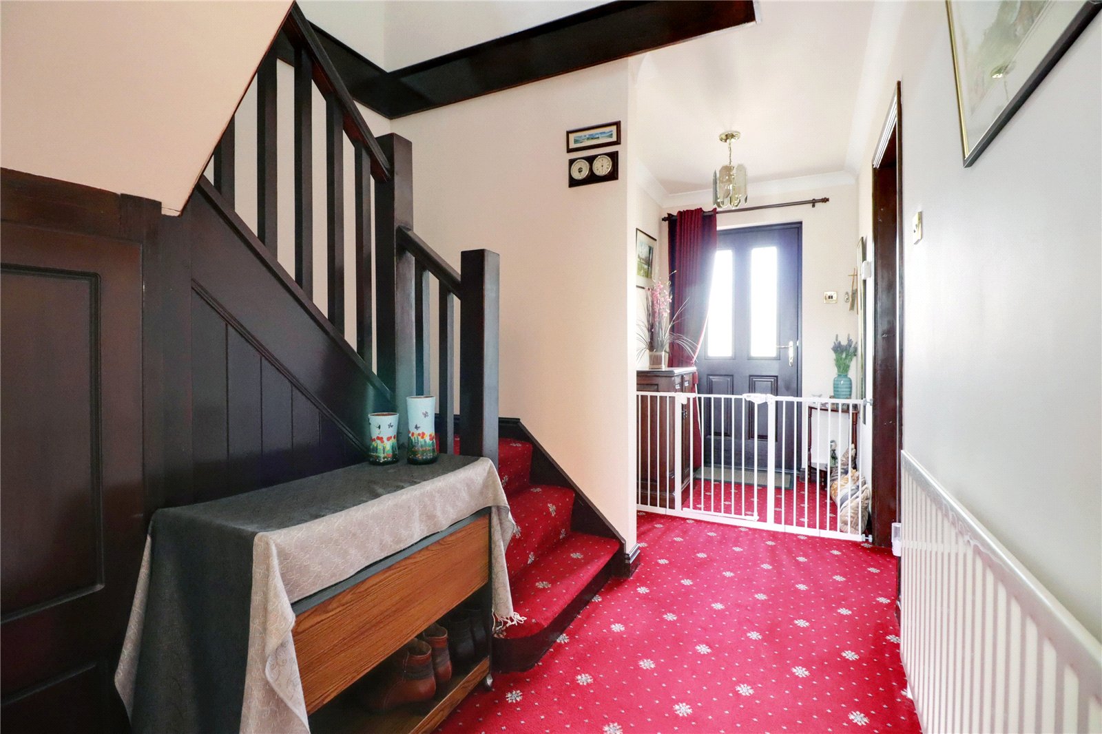 Central Reception Hallway 8'1" x 15'2" (2.46m x 4.62m). Front composite double glazed entrance door with inset patterned and leaded glazing, return staircase leads to the first floor accommodation with open spell balustrading, under the stairs storage, enjoys a feature vaulted ceiling and wall to ceiling coving.