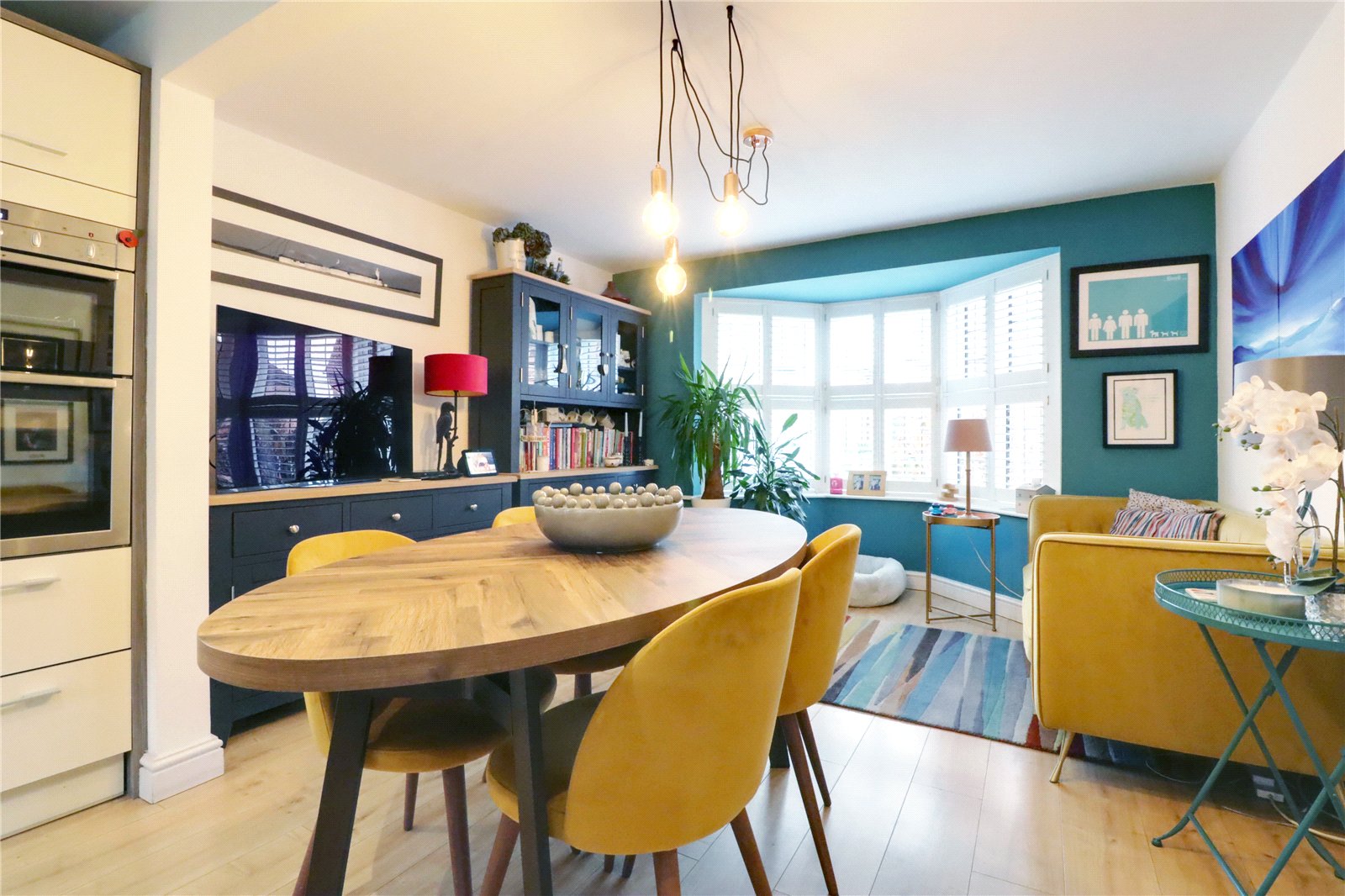 Front Sitting/Dining Room 11'9" x 9'9" (3.58m x 2.97m). With a projecting front uPVC double glazed and leaded bay window with quality fitted shutters, TV point and continuation of flooring.