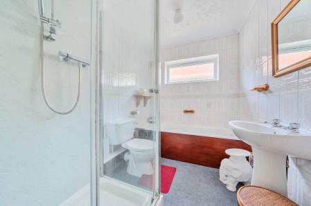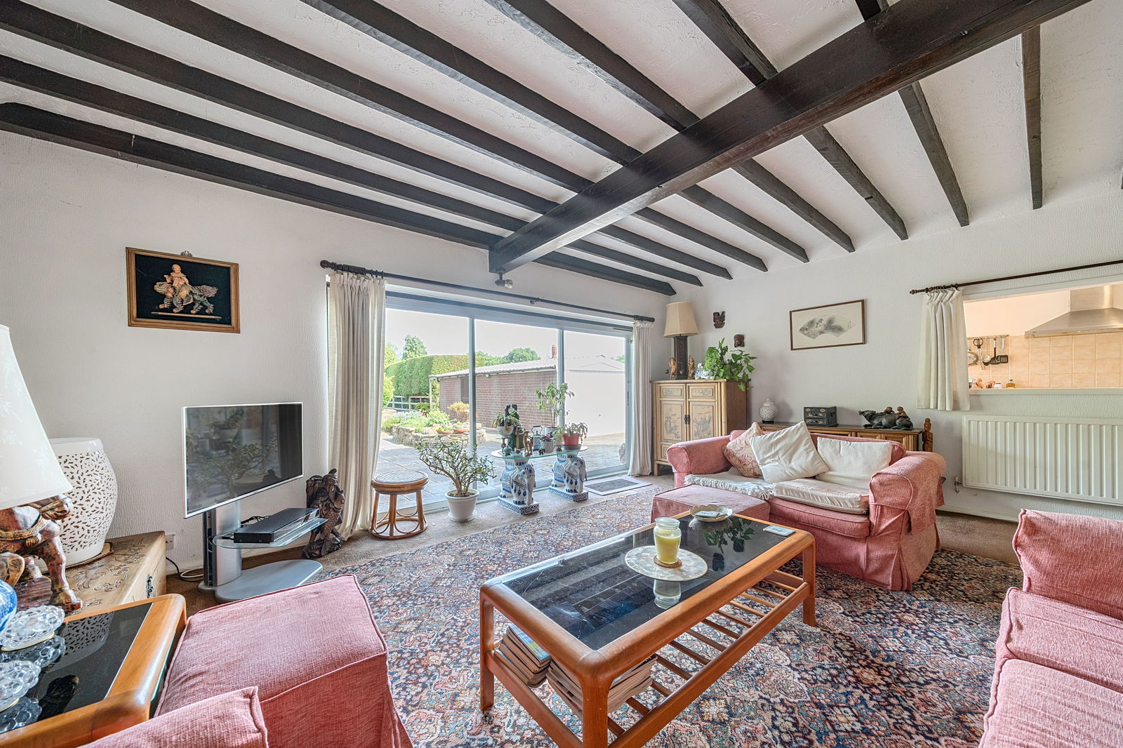 Inside, the home is well laid out, featuring two ground-floor bedrooms and bathroom, a generous reception room with exposed ceiling beams and large sliding doors opening to the rear patio, and a bright, extended kitchen with views across the garden. The separate dining room is perfect for entertaining, with space for a a second seating area and enhanced by bay windows that fill the space with natural light. Upstairs, two further double bedrooms and a shower room provide ample space for family or guests. There is also a huge walk-attic space.