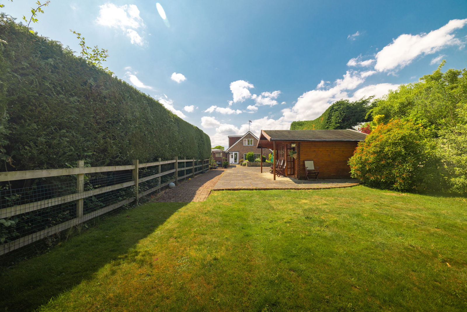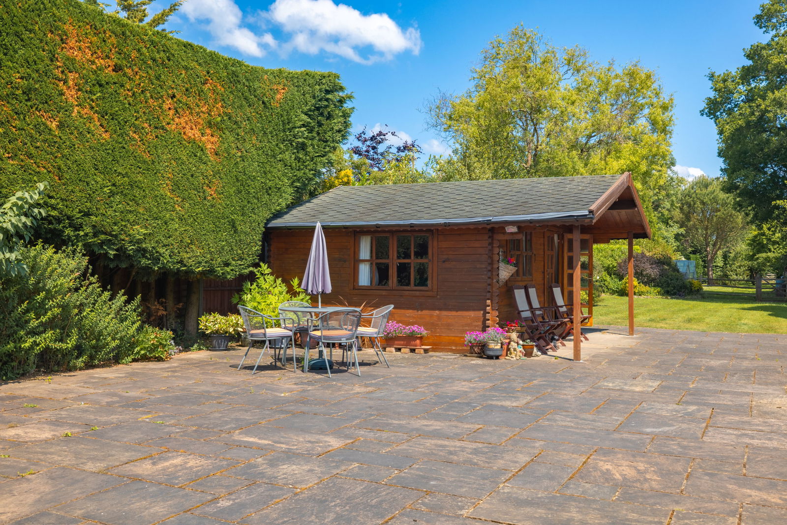 The plot extends to include stunning mature gardens, a delightful cabin, ideal for relaxation, entertaining or home working, and a detached garage with additional workshop space. There is extensive parking available for numerous vehicles on the gated front driveway.