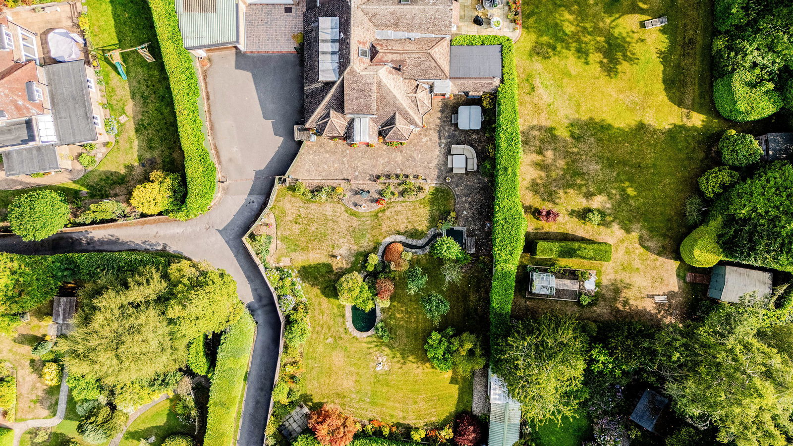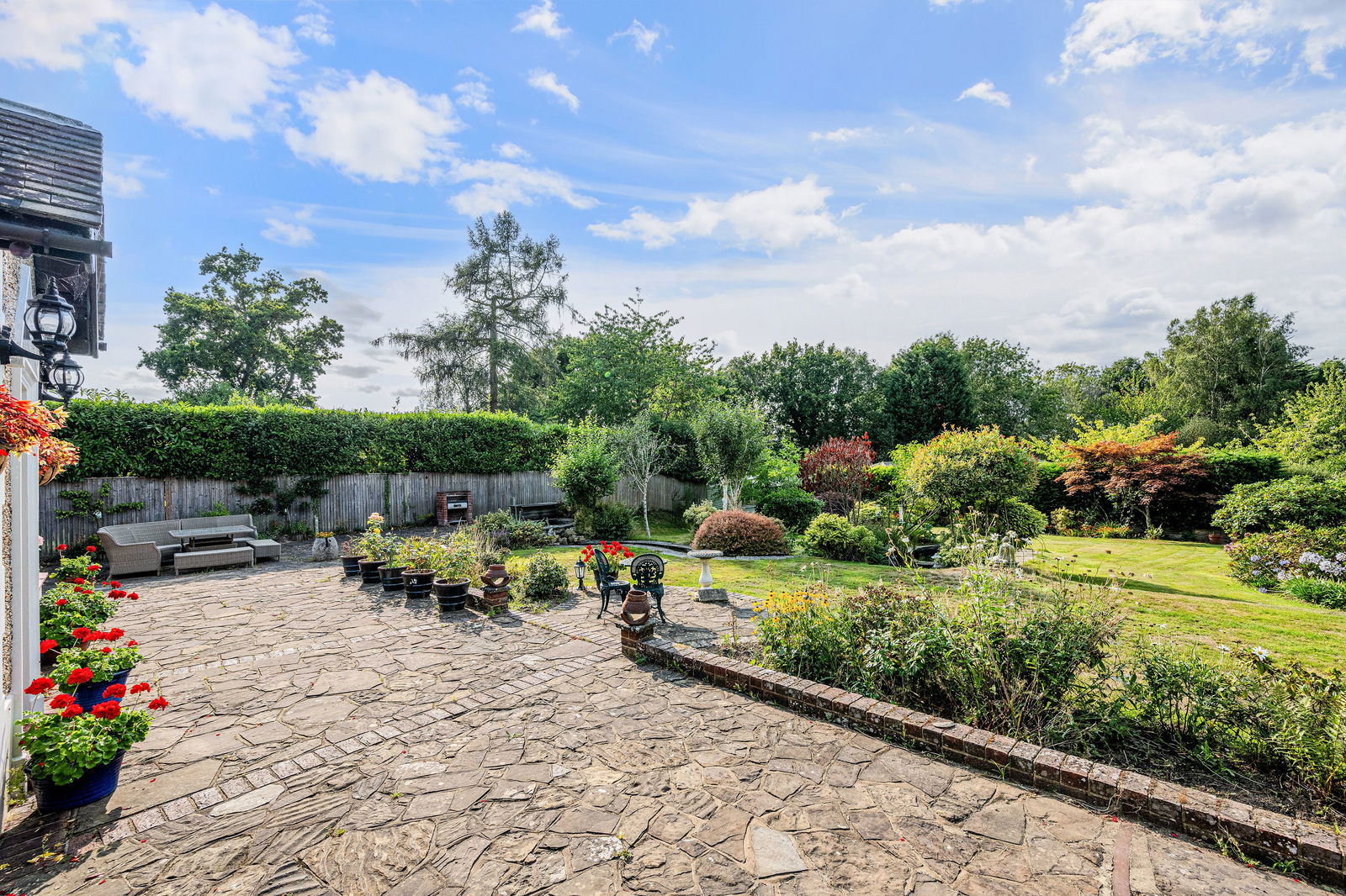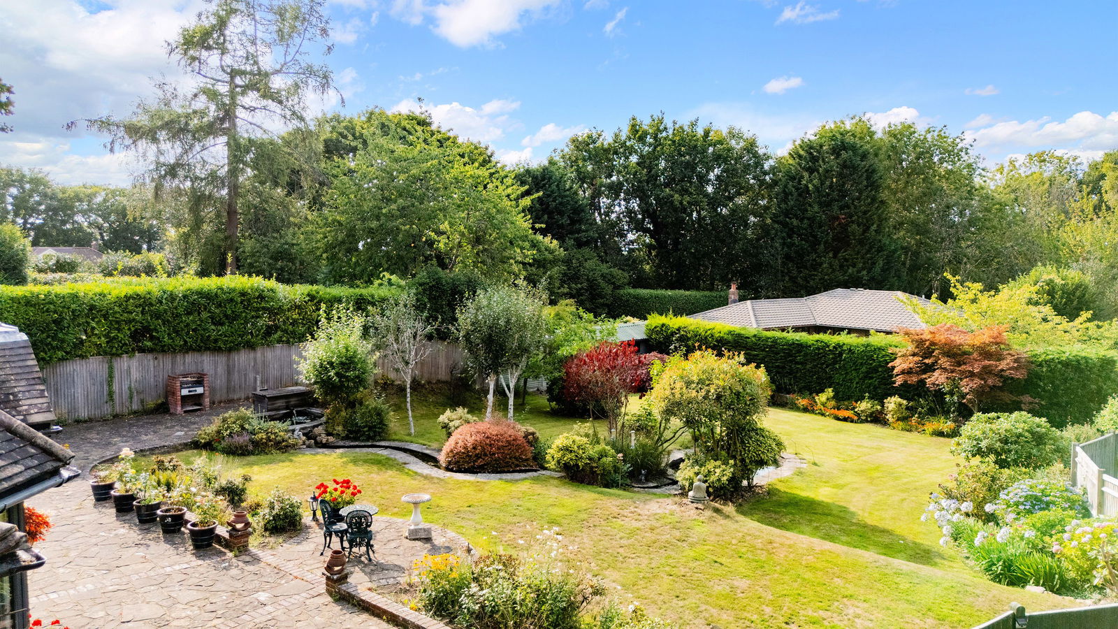 The grounds are a particular highlight, private, mature, and well maintained. A large patio wraps around the rear of the house, providing plenty of space for outdoor dining and relaxation. The detached double garage is equipped with power and lighting, with additional WC facilities, offering scope for a workshop or home gym if desired.