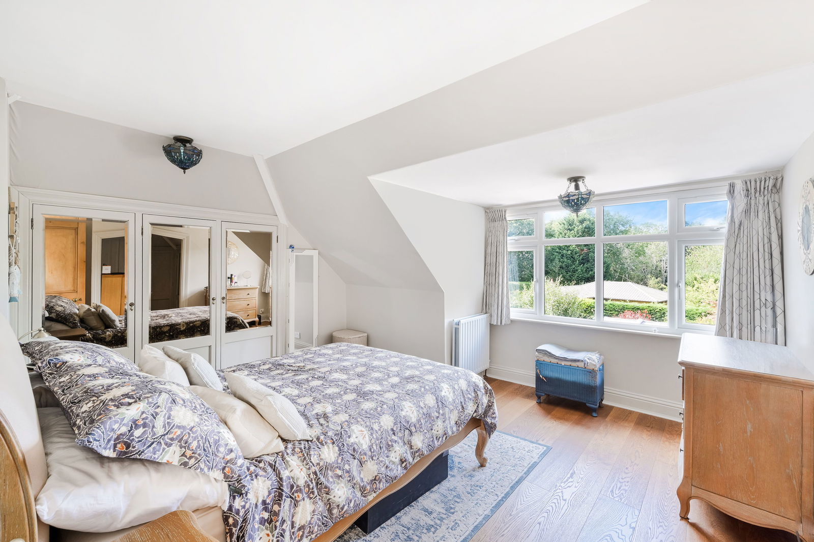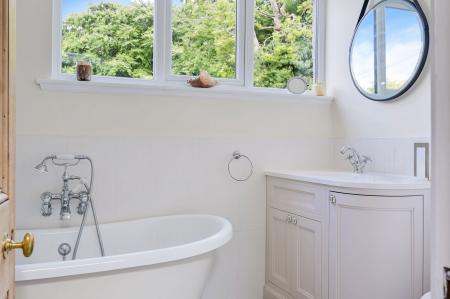 Upstairs, two staircases lead to two distinct bedroom areas. One provides access to a large principal bedroom with built-in storage and a luxurious four-piece bathroom featuring a freestanding bath and walk-in shower. The second leads to a private third bedroom, which enjoys delightful views and would suit guests, teenagers or those working from home.