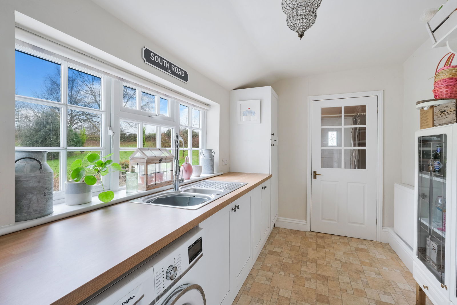 The house is approached via a long sweeping driveway leading to a turning circle and car port, immediately setting the tone for the sense of privacy and space on offer. Internally, the accommodation is well balanced and ideal for modern family living. The welcoming entrance porch opens into a dual-aspect dining room with an attractive bay window, perfect for entertaining. There is a downstairs cloakroom, a separate study ideal for home working, and a comfortable living room centred around a log burner. The heart of the home is the fitted kitchen/breakfast room, featuring a central island, an oil-fired Aga and a comprehensive range of units, complemented by a utility room and a separate boot room, both providing excellent practical space.