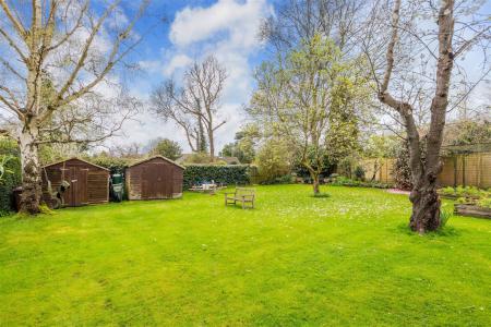 Outside is a beautiful West facing courtyard/patio area with a lawned area leading to a good sized private rear garden with mature trees and two sheds. To the side is a further courtyard area with raised pond, access to the front of the property and garage.