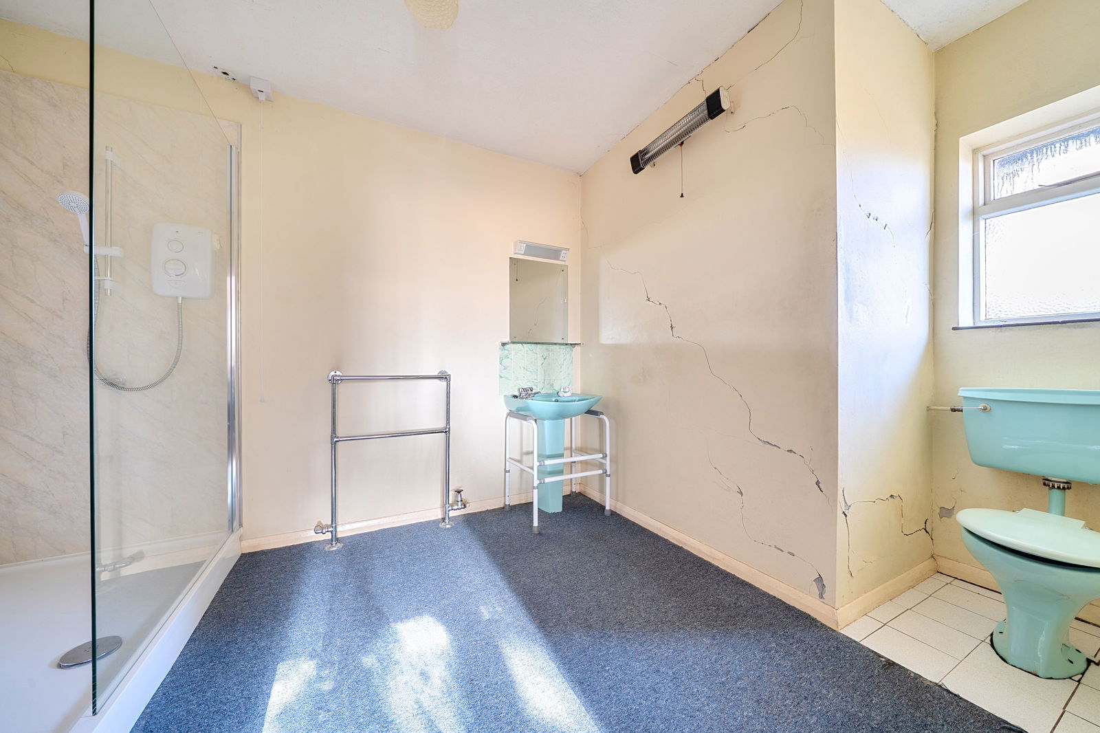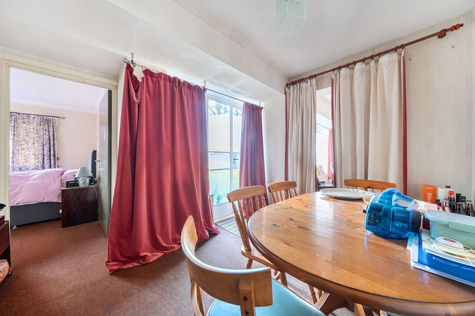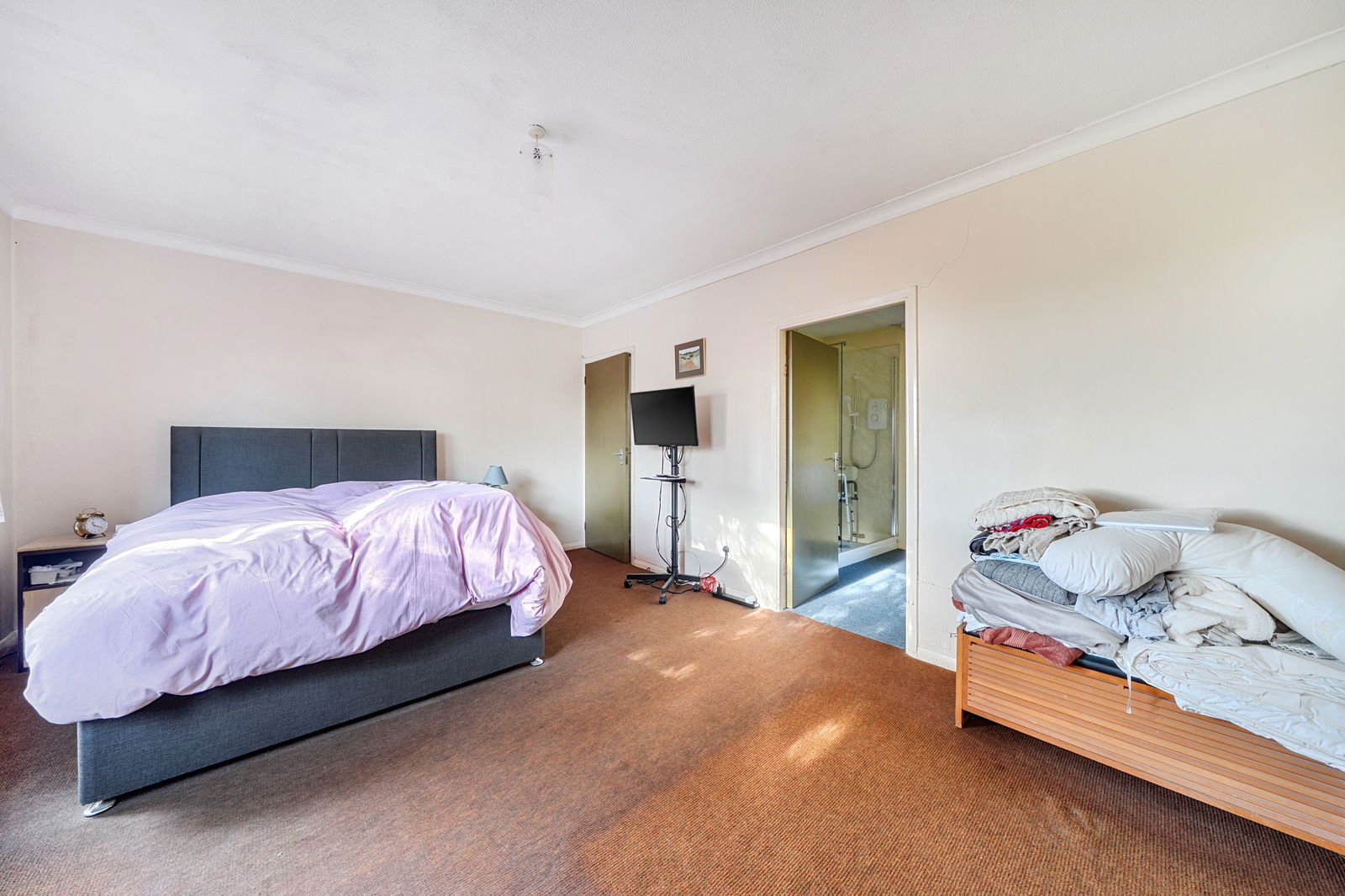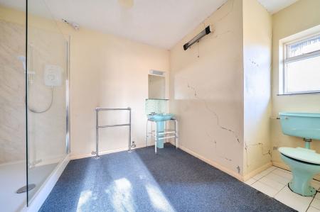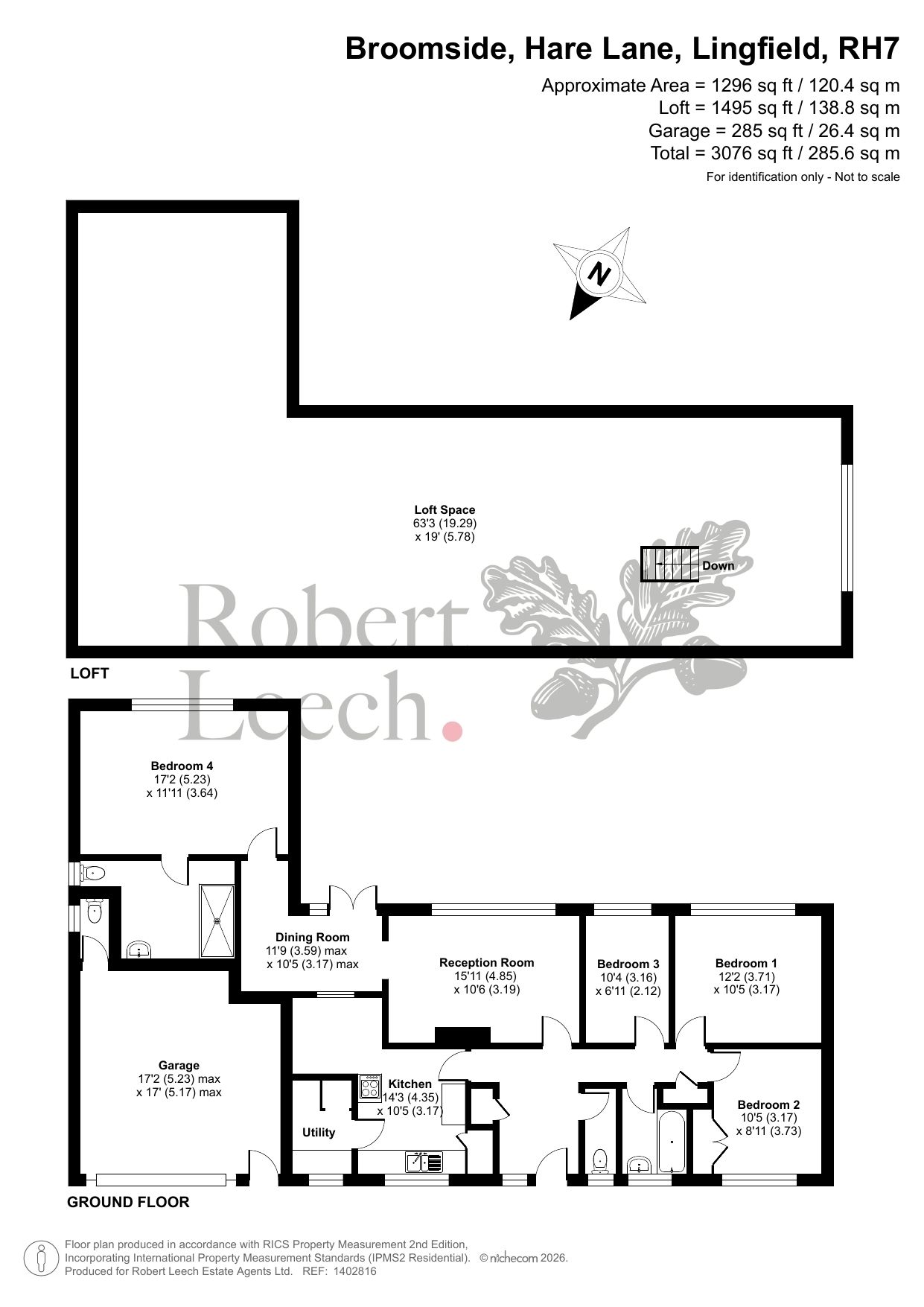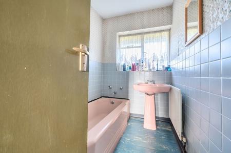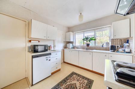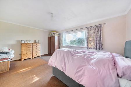 The ground floor is arranged around a central hallway and includes a spacious reception room with views over the garden, a separate dining room, kitchen and utility area, and four bedrooms served by bath and shower facilities. The layout lends itself well to reconfiguration, with potential to create open-plan living spaces or enhance the bedroom accommodation. Above, the extensive high-roofed loft space spans the footprint of the bungalow and offers excellent potential for conversion, subject to planning, further increasing the overall living space.