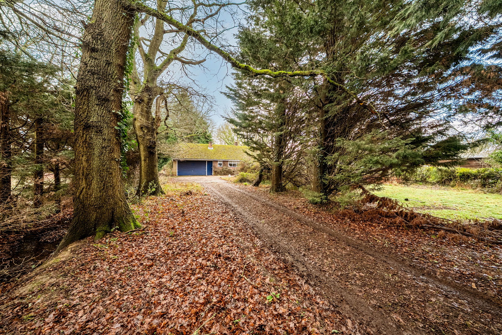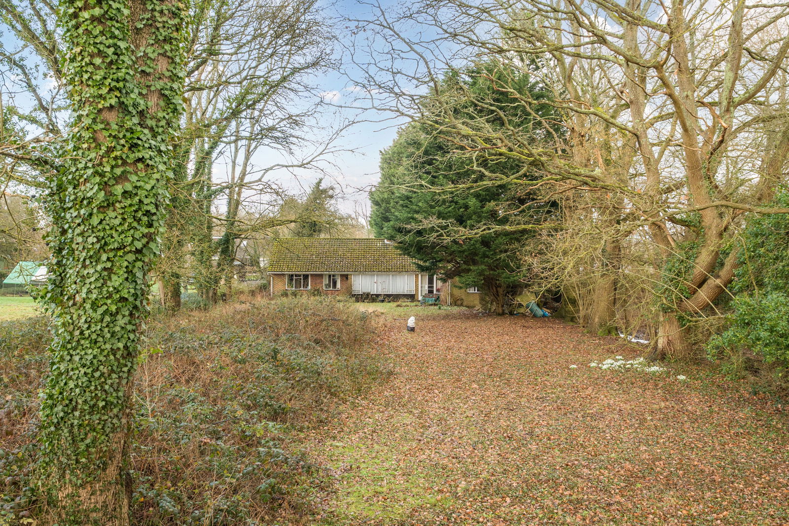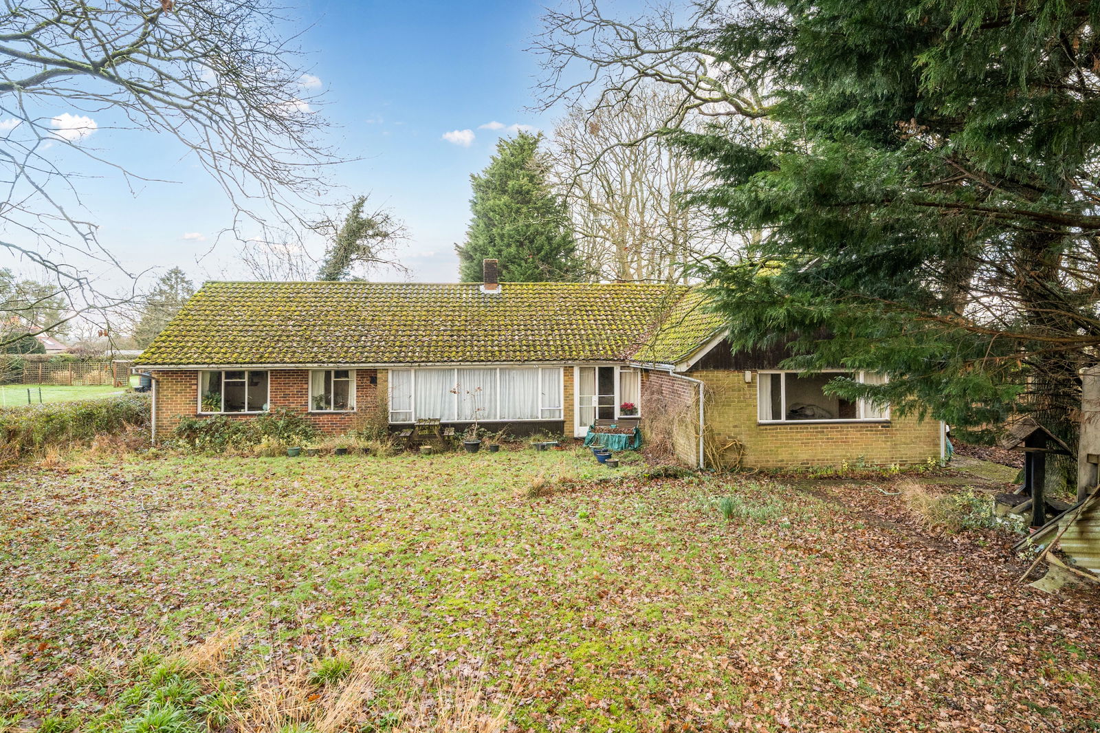 Externally, the bungalow sits centrally within its plot, surrounded by mature gardens and paddock that provide privacy, a strong sense of seclusion and ample room for landscaping, outbuildings or further development, subject to consent. The long driveway and garage provide plenty of parking, while the scale of the plot offers substantial development opportunities to those seeking space for gardening, leisure or equestrian interests.