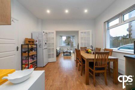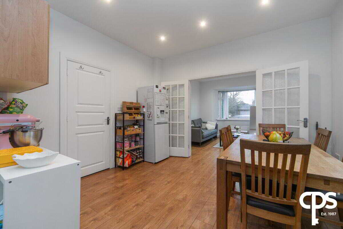 Laminate wooden flooring with double doors leading to the kitchen/dining area.