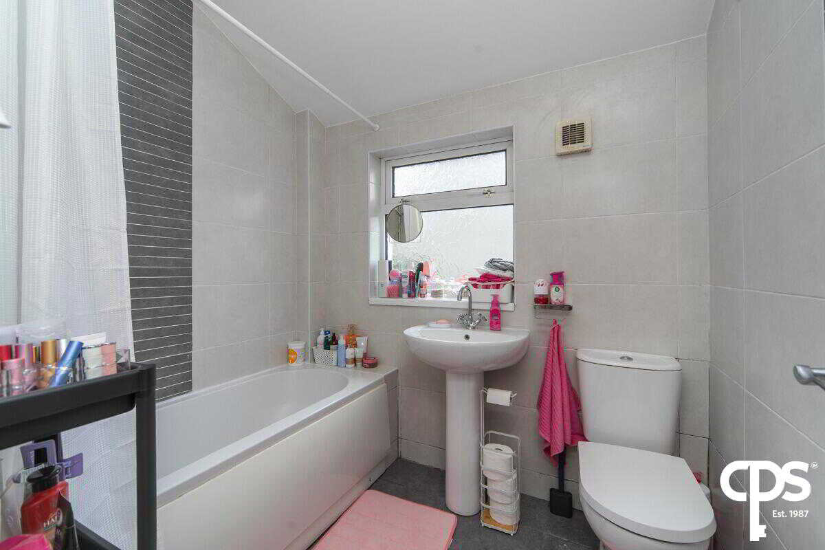 Fully tiled family bathroom with three-piece white suite.