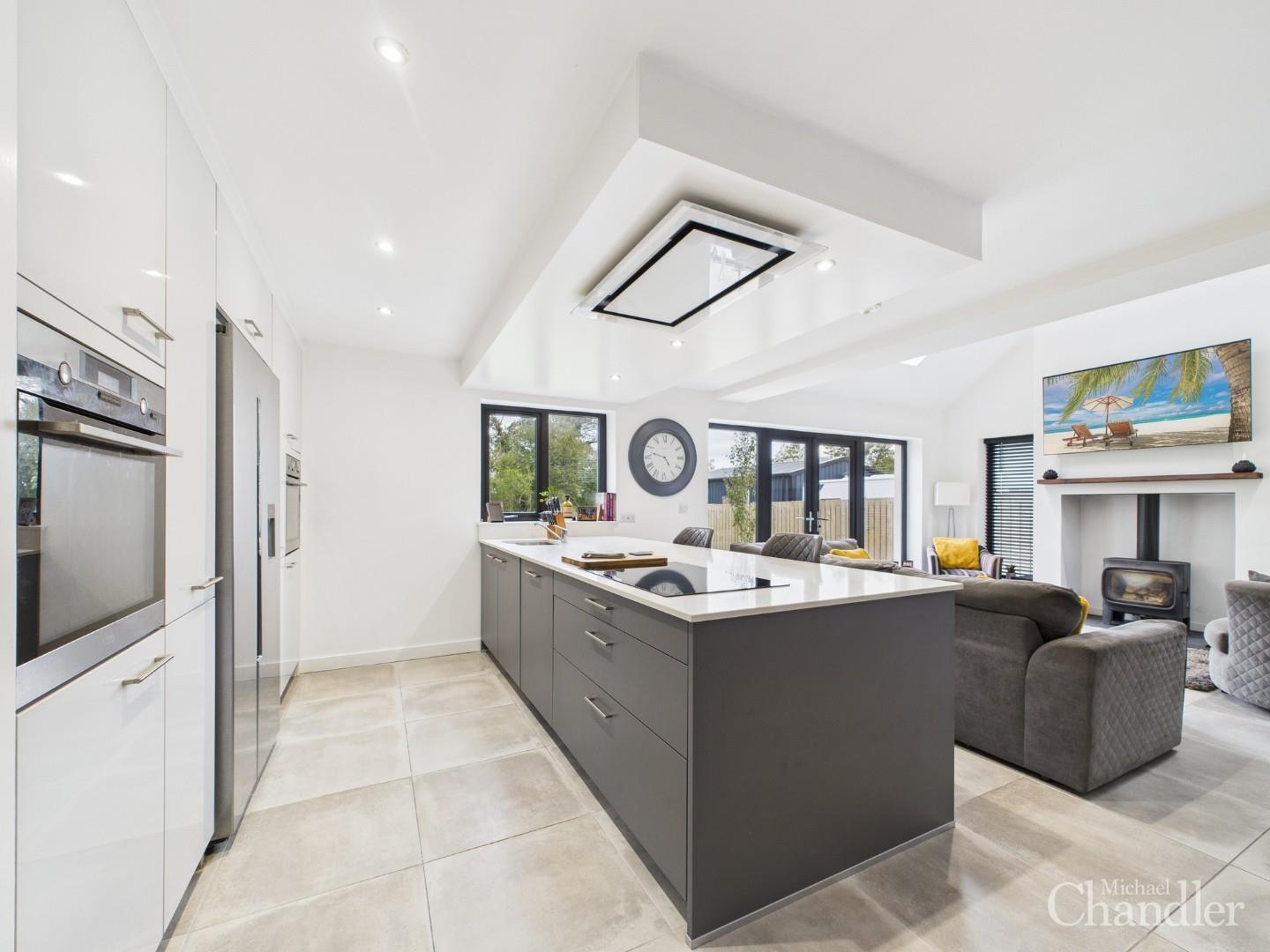 Stunning open-plan kitchen, dining and living area with high ceilings & wood burning stove