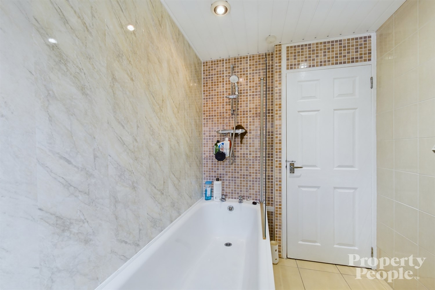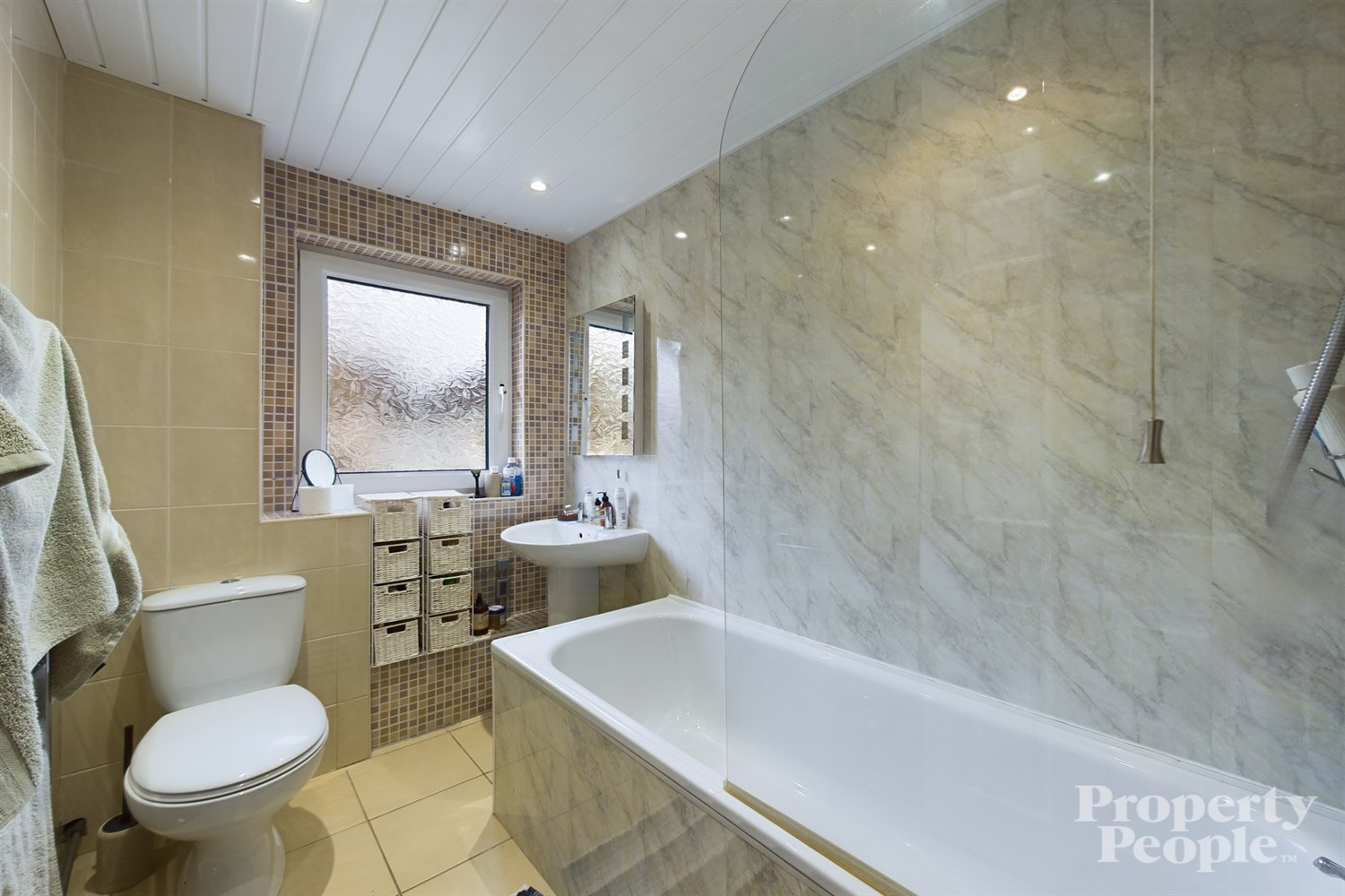 Bath, overhead shower, glass shower screen, heated towel rail, WHB & WC.