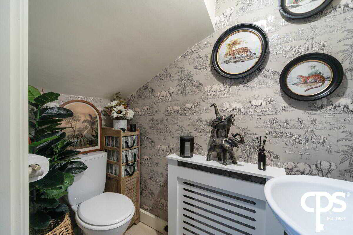 Tile flooring, low flush WC and wash hand basin with chrome mixer tap.