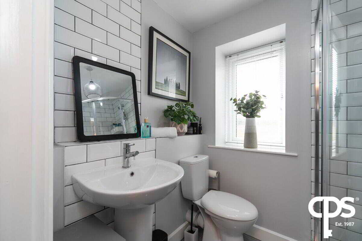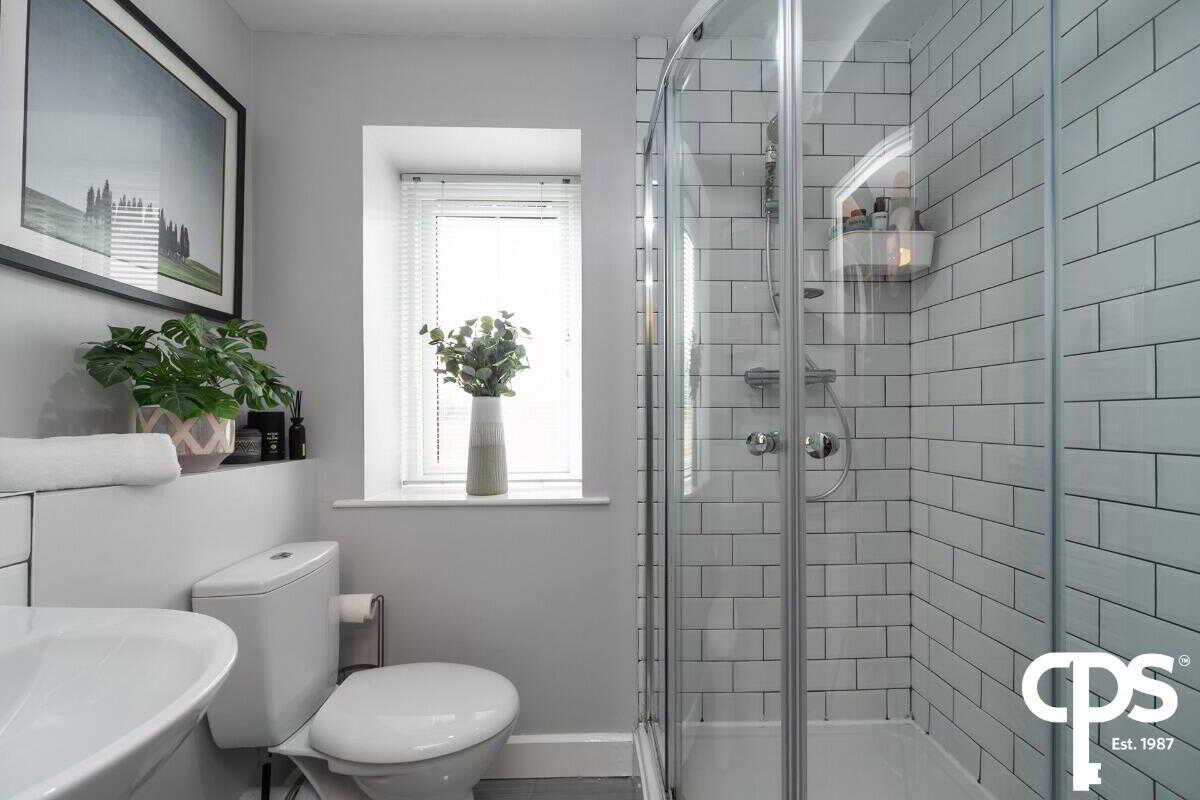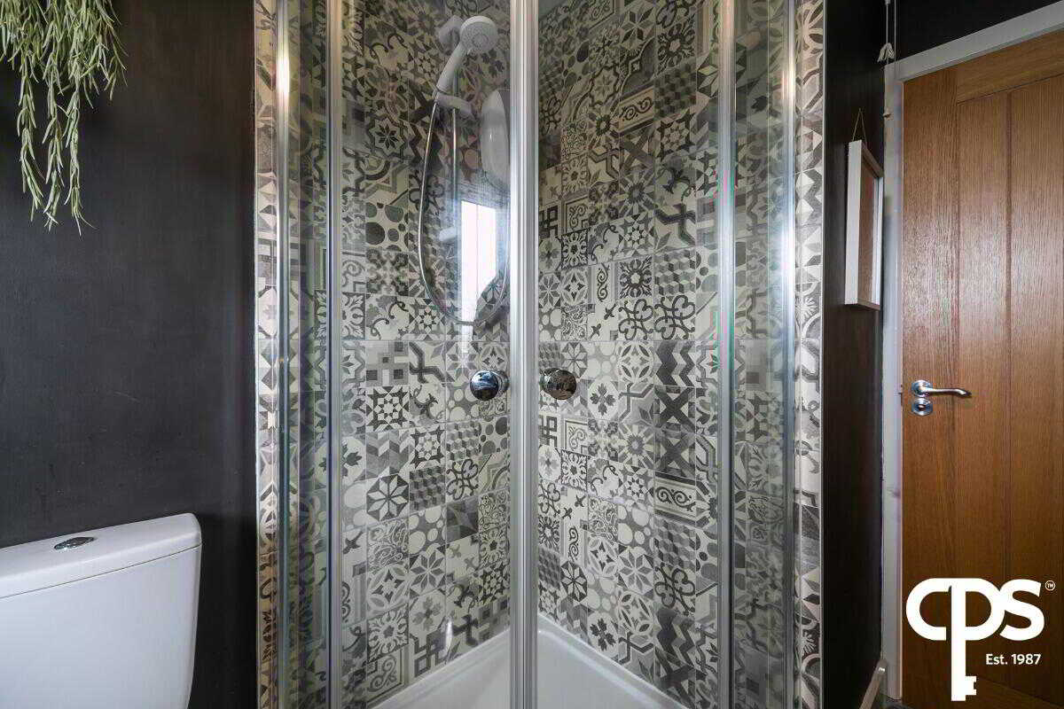 Tile flooring, chrome corner shower with full height white brick porcelain tiling, thermostatic mixer taps, low flush WC and wash hand basin with chrome mixer tap.