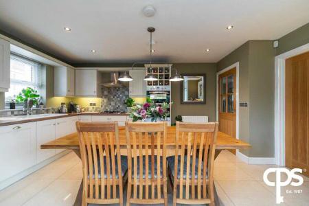 Tile flooring, range of high- and low-level taupe shaker units with brushed chrome handles and wood effect laminate worktops. Integrated fridge freezer, dishwasher and double oven. White porcelain sink with drainer, chrome swan neck tap, stainless steel extractor hood and feature wine rack.