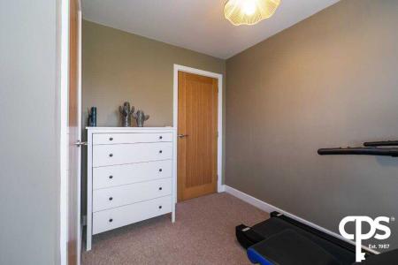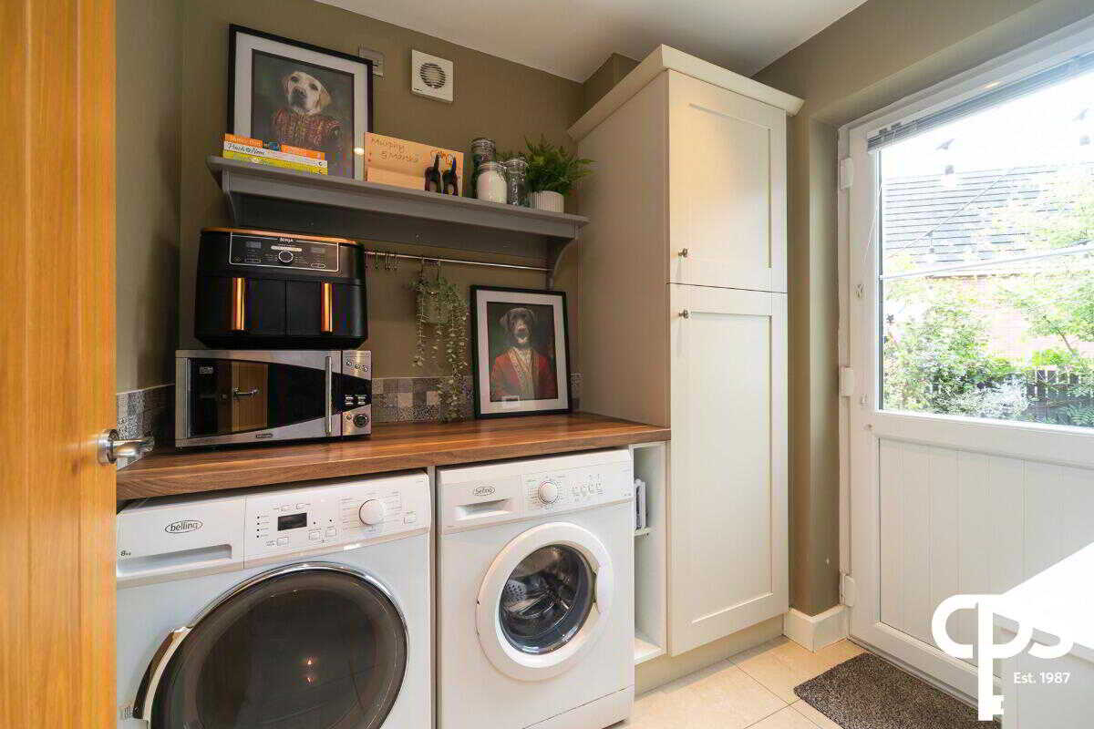 Tile flooring, fitted with matching taupe shaker units and wood effect laminate worktop. Plumbed for washing machine and tumble dryer. PVC external door to rear garden.