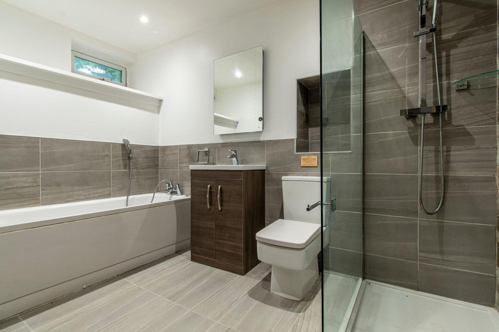 On the first floor there are two double bedrooms, with built in storage, and a single room which could fit a cot or be used as an office. The four piece bathroom suite services the property.