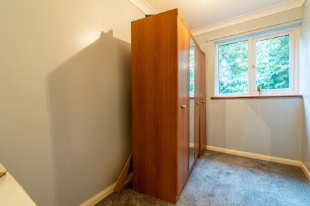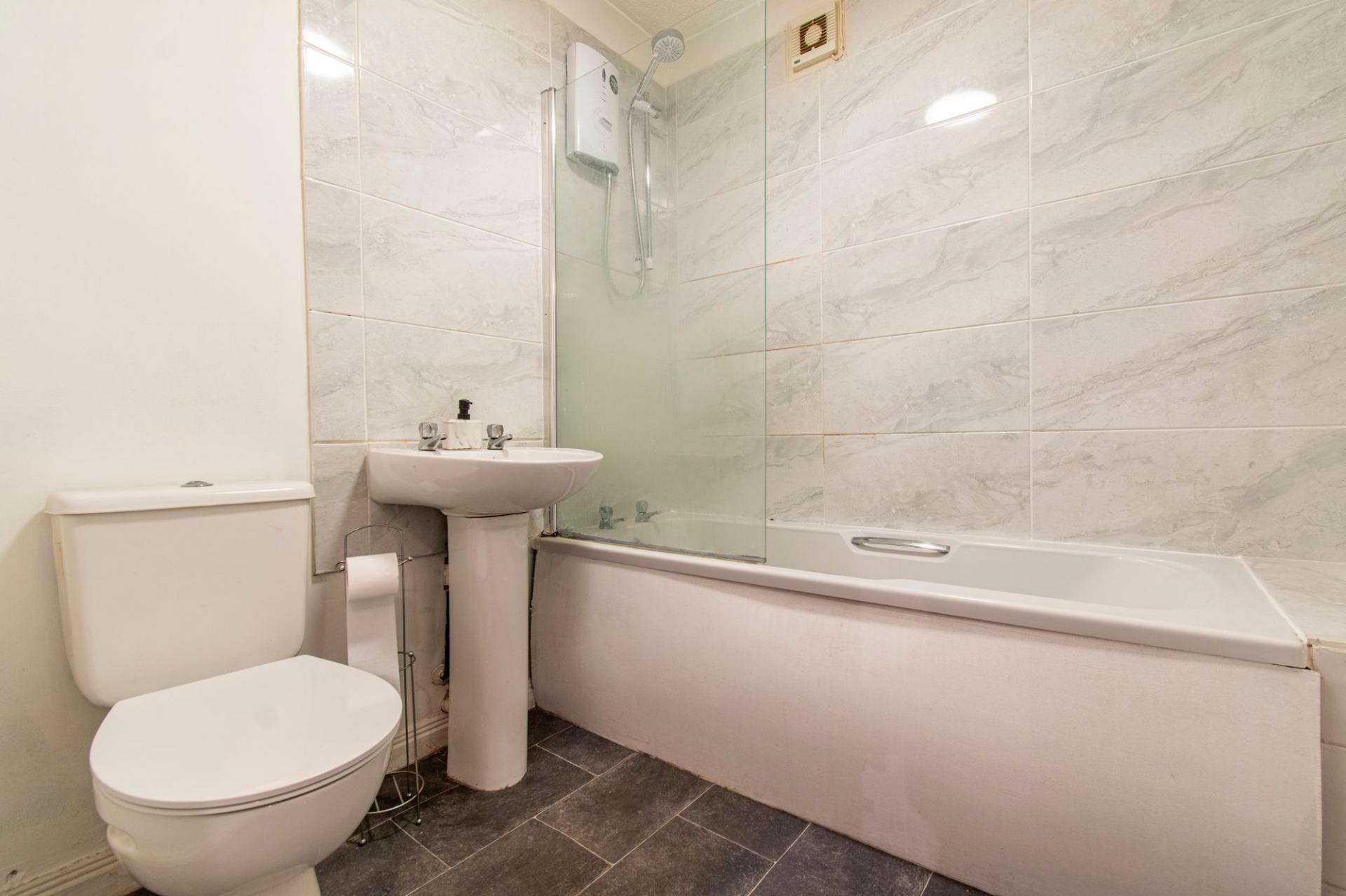 There are two bedrooms, including a well-sized master and a versatile second bedroom suitable for guests or home office use. The bathroom features a white suite with an electric shower over the bath.