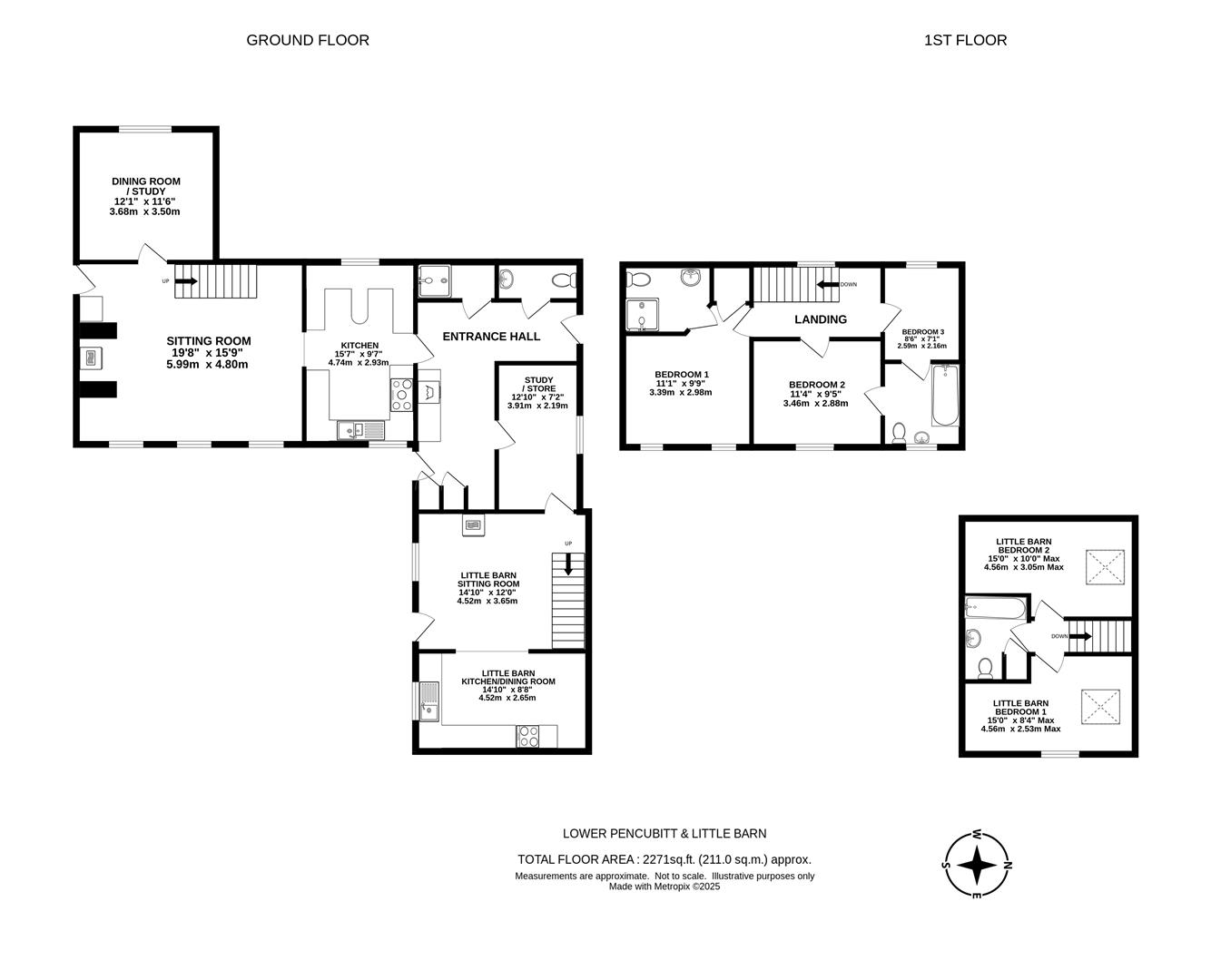 Lower Pencubitt Barn - Lower Pencubitt Barn is very well presented with character and modern contemporary features including slate flagstone and tiled floors, beamed ceilings, large fireplace, double glazed windows and oil fired central heating. The accommodation comprises:- Entrance Hall; 'L' shaped with beamed ceiling, slate flagstone floor, fitted wall and base units, space and plumbing for washing machine, and door leading to rear garden. Study / Cloakroom and Store; interconnecting door to Little Barn, beamed ceiling, window to the front. Cloakroom; vanity unit, bespoke wash basin, w/c and heated towel rail. Former Shower room / Store. Kitchen / Breakfast Room; a dual aspect room with windows to the front and rear, fitted wall and base units under black granite worksurfaces, matching breakfast bar, Stoves Richmond Deluxe range cooker with five ring induction hob, integrated Neff dishwasher, tiled floor,. Sitting / Dining Room; large cut stone and granite fireplace, Wood Warm woodburning stove, three windows overlooking the rear garden and door to the side. Staircase to the first floor. Dining Room / Study; beamed ceiling, window to the front. On the First Floor; Landing; window to the front overlooking the garden. Bedroom 1; exposed ceiling beams window to the rear garden, built in storage cupboard. En suite; shower enclosure, w/c, wash basin, heated towel rail. Bedroom 2; window the rear garden, door to the Jack & Jill bathroom. Bedroom 3 / Dressing Room with window to the front and door to the Jack & Jill bathroom; w/c, wash basin, bath with shower over, heated towel rail.