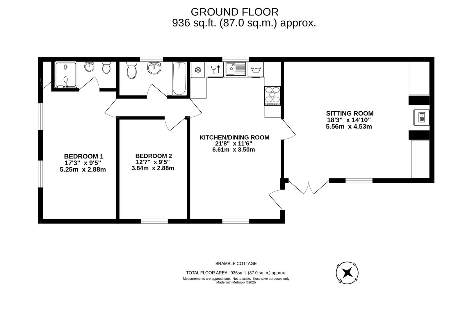 Bramble Cottage (Sleeps 4) - Bramble Cottage is a well-appointed 2 bedroom holiday letting barn benefitting from double glazed windows and an oil fired central heating, briefly comprising Kitchen / Dining Room; a dual aspect room with windows to the front and rear, tiled floor, beamed ceiling, fitted wall and base units, Beech effect worksurfaces, stainless steel Belling electric range cooker with induction hob with matching extractor hood above, integral dishwasher and washing machine. Sitting Room; Large cut stone fireplace Villager woodburning stove, beamed ceiling, window and French Door to the front opening onto the paved patio terrace ideal for alfresco dining and entertaining. Inner Hall. Bedroom 2; a double / twin room, beamed ceiling and window to the front overlooking the garden. Bathroom; Bath with shower over, wash basin, w/c, heated towel rail. Bedroom 1; a double room, windows overlooking the garden, beamed ceiling, built in storage cupboard. En suite; shower enclosure, vanity unit, wash basin, w/c, heated towel rail and fully tiled walls and floor.