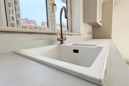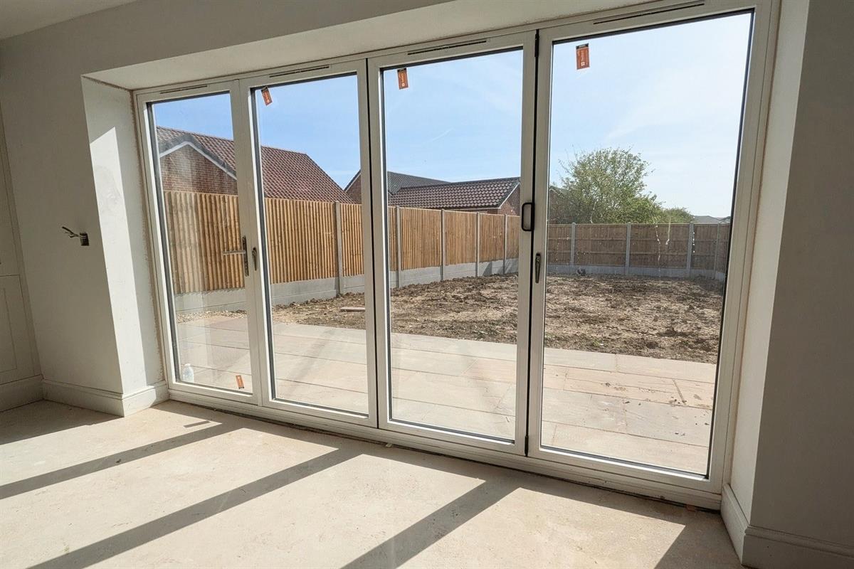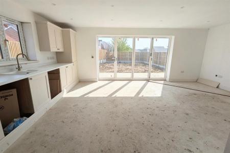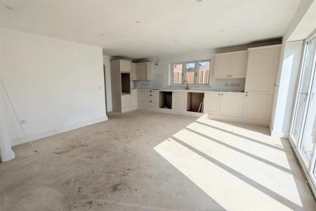 Modern open plan feel with kitchen area that is fitted with panelled fronted units with square edge work surfaces, matching eye level cupboards, single drainer sink unit with mixer tap, built in store cupboard, double glazed side window, bi fold doors to rear garden