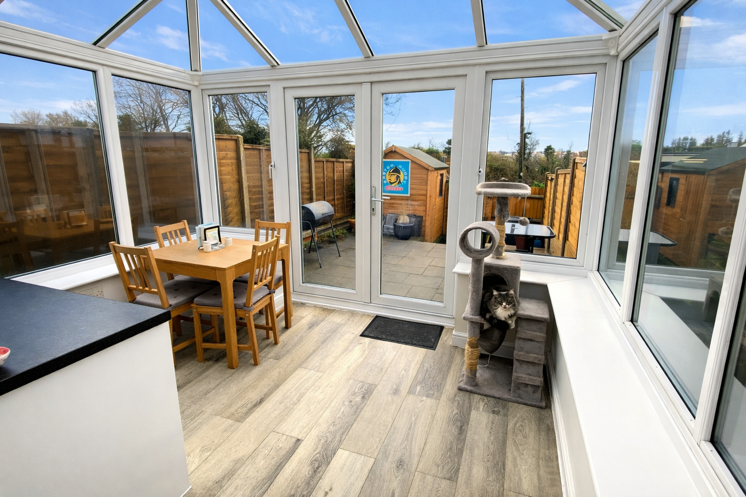 Entry to the property is in to the living room which overlooks the front garden and a door leads through to the kitchen and conservatory. This is a great space and the heart of the home with the conservatory currently used as a dining room with a work surface and plumbing for a washing machine in one corner.