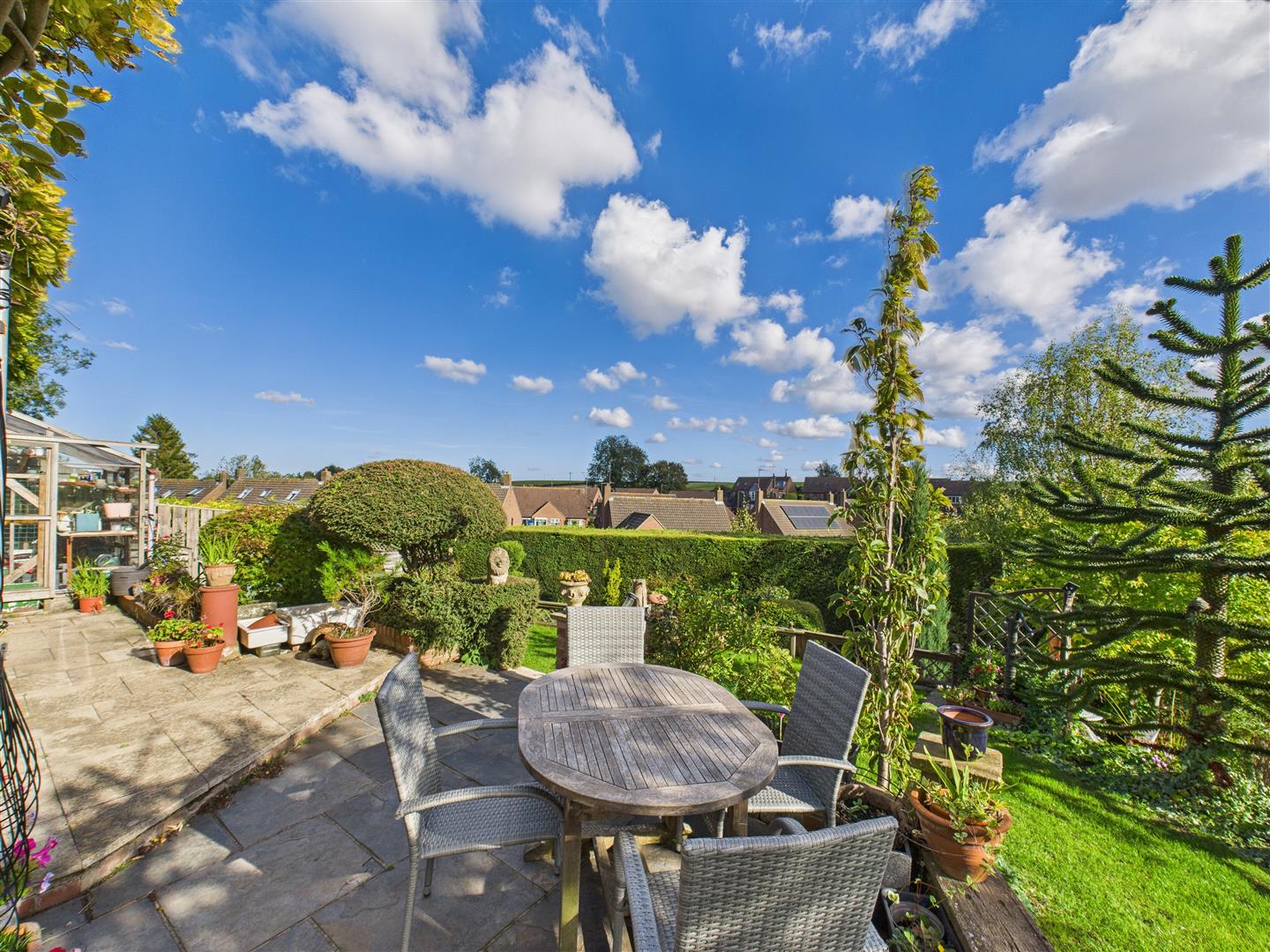Outside - Situated within a private courtyard, the property benefits from parking for up to two vehicles and there is an integral garage. A true highlight of this property is the stunning rear garden, a creative, multi-level outdoor space that perfectly captures the open countryside views. Designed with several areas of interest, it includes lawn and patio sections, charming water features, a decked seating area with a workshop beneath, and a greenhouse.