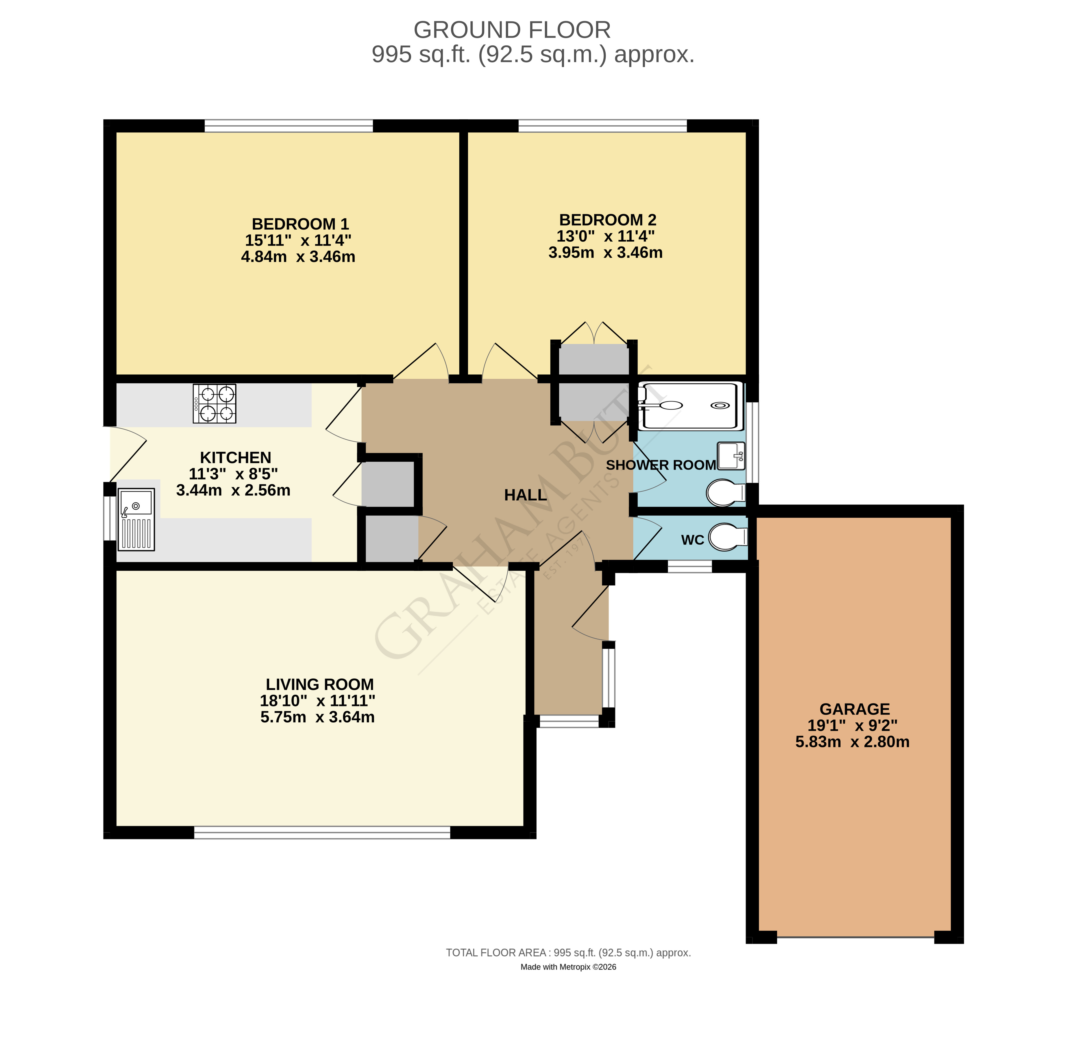 Offered to the market chain free, this well-proportioned detached bungalow occupies a lovely plot with a private, east-facing rear garden enjoying a good degree of seclusion, with no neighbouring properties overlooking.The accommodation extends to approximately 995 sq ft and offers a generous living room, ideal for both relaxing and entertaining, along with a well-laid-out kitchen providing ample worktop and storage space. There are two spacious double bedrooms, both excellent sizes, complemented by a modern shower room and separate WC, adding to the practicality of the layout.Externally, the property benefits from a private driveway providing off-road parking, leading to a garage, while the attractive rear garden provides a peaceful setting and enjoys the morning sun thanks to its easterly aspect.A wonderful opportunity to acquire a detached bungalow in a desirable setting, offering privacy, space and excellent potential.