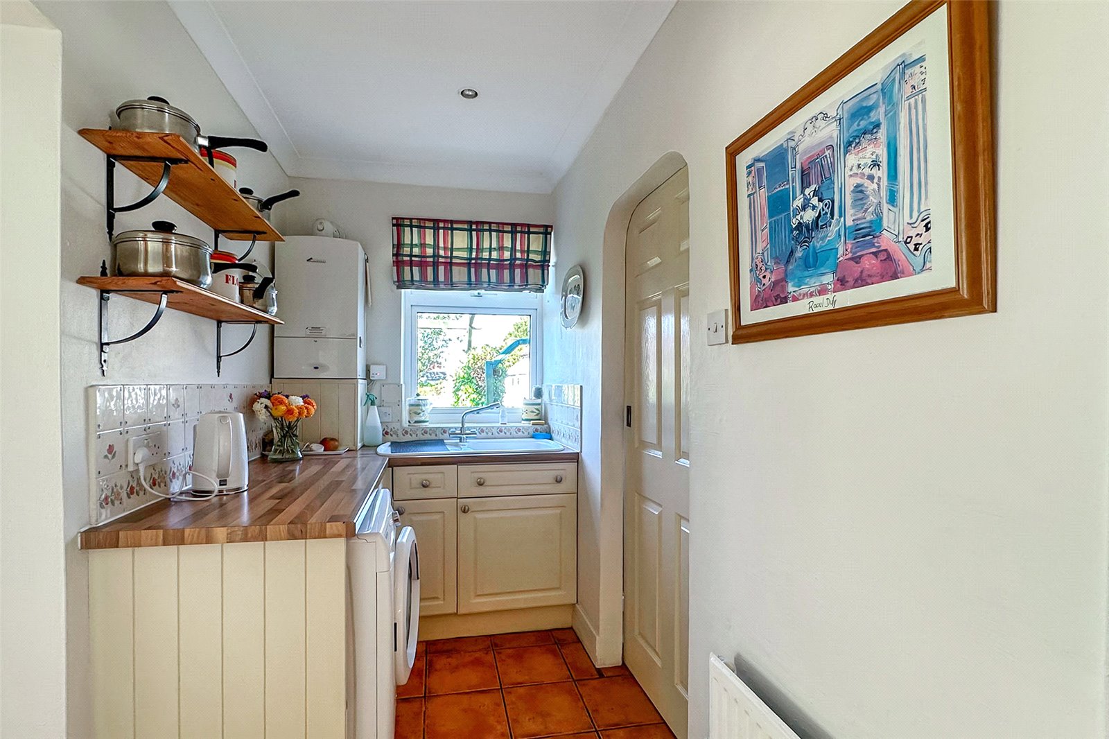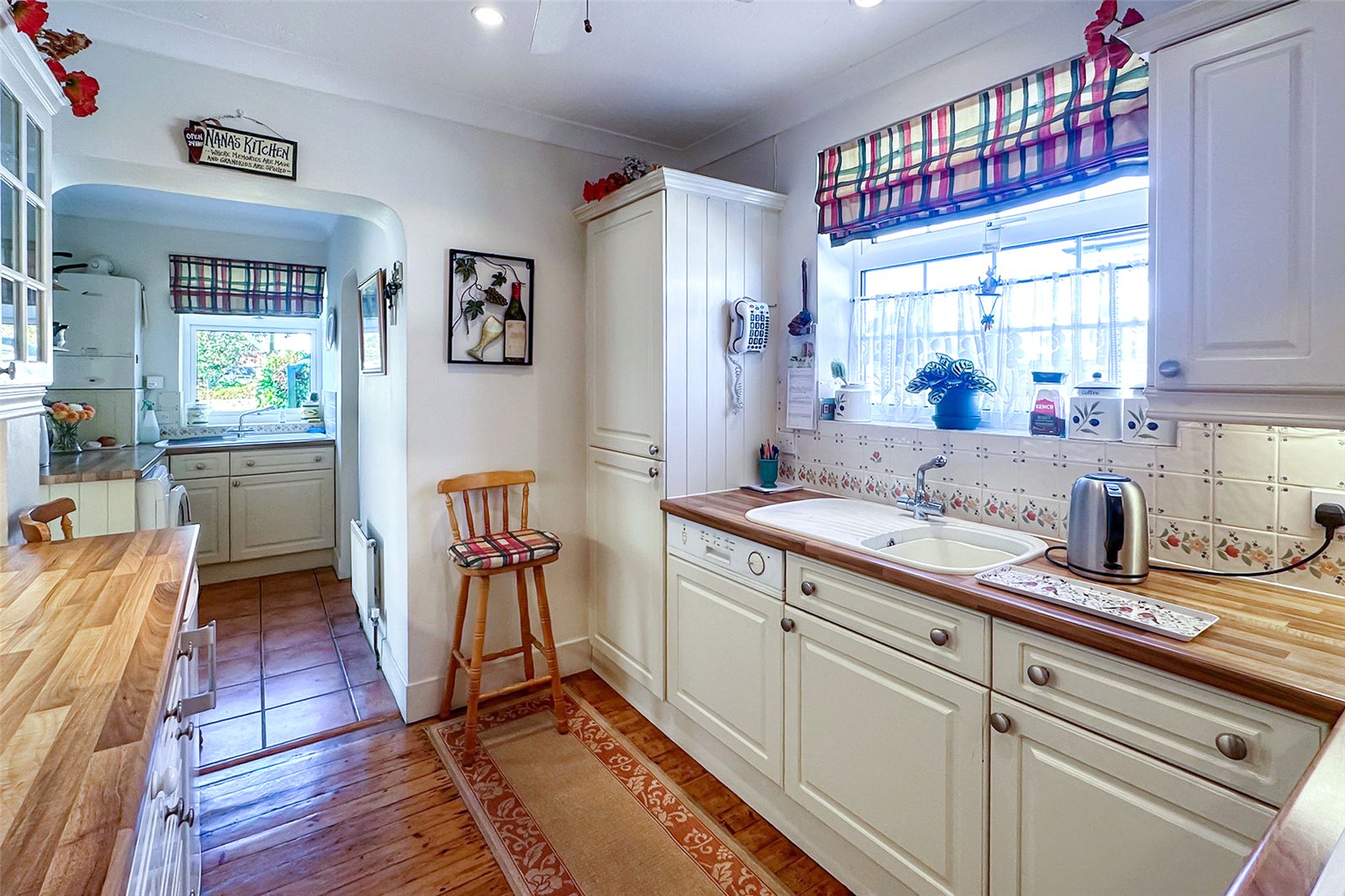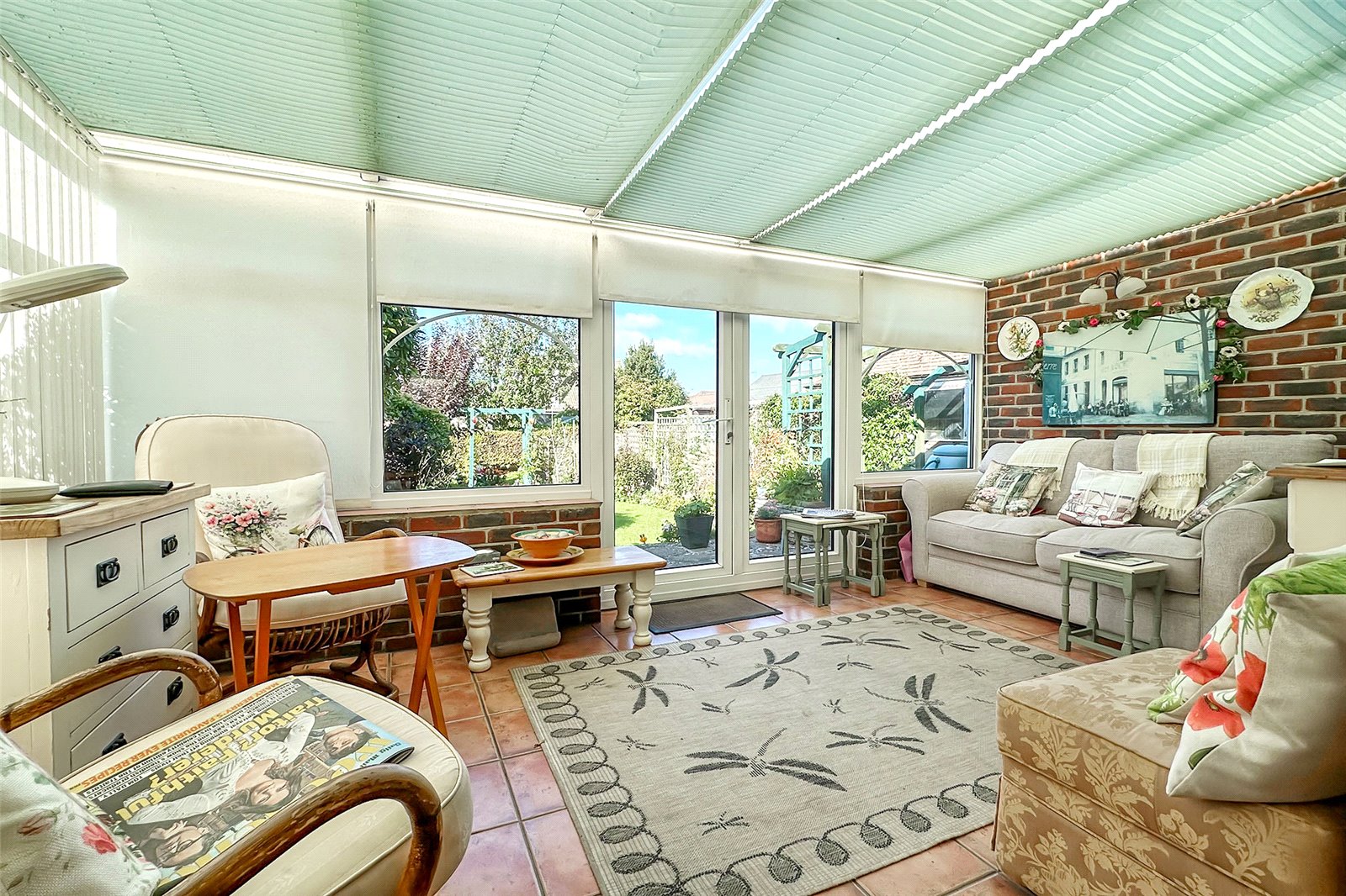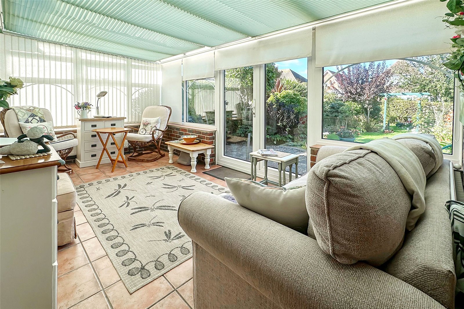 The kitchen is stylish and well-appointed, flowing seamlessly into a practical utility area that also includes a separate shower room. The main bathroom is fitted with a bath, basin, and WC. The conservatory is a standout featurebathed in natural light and overlooking the west-facing garden.