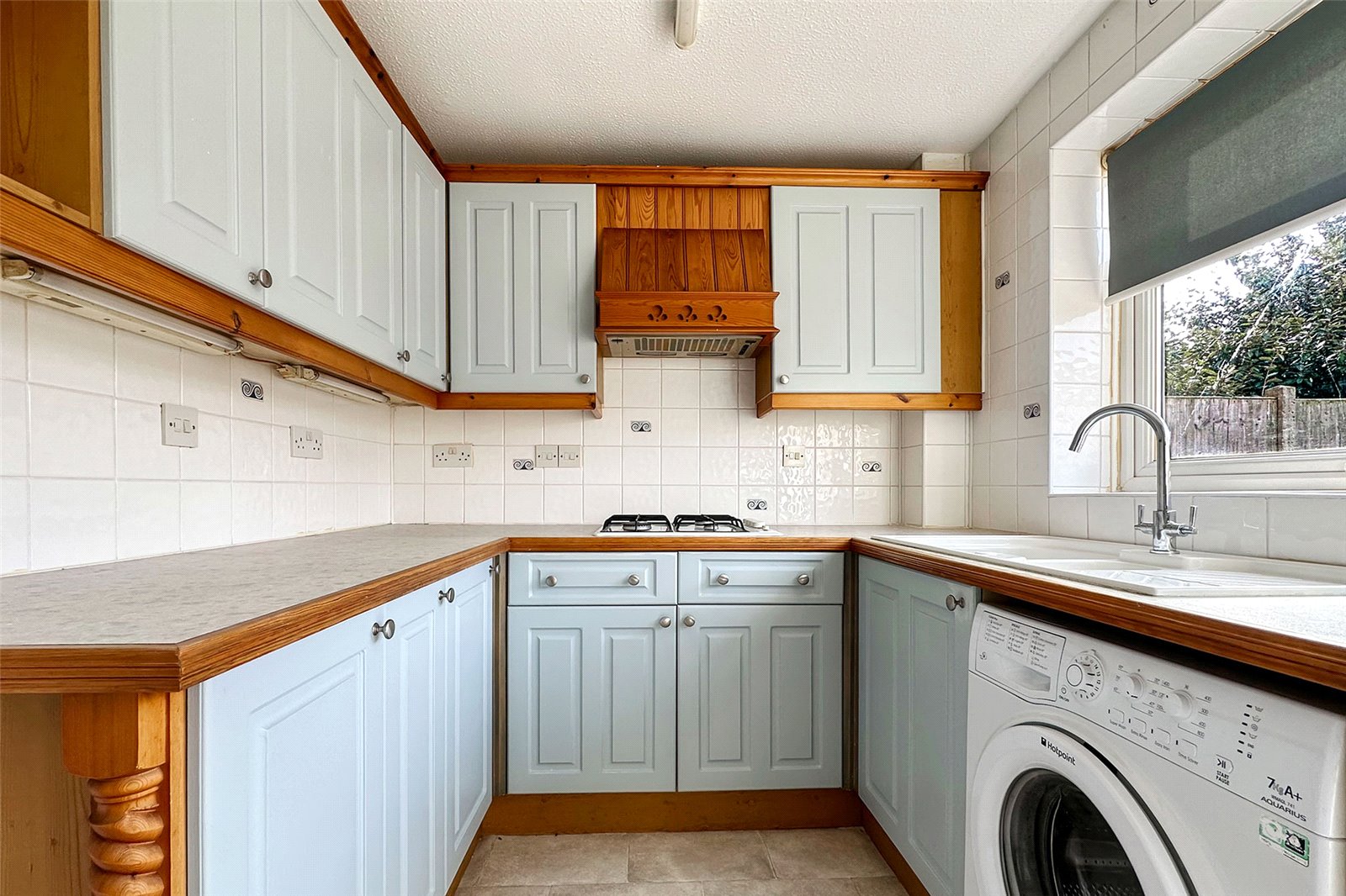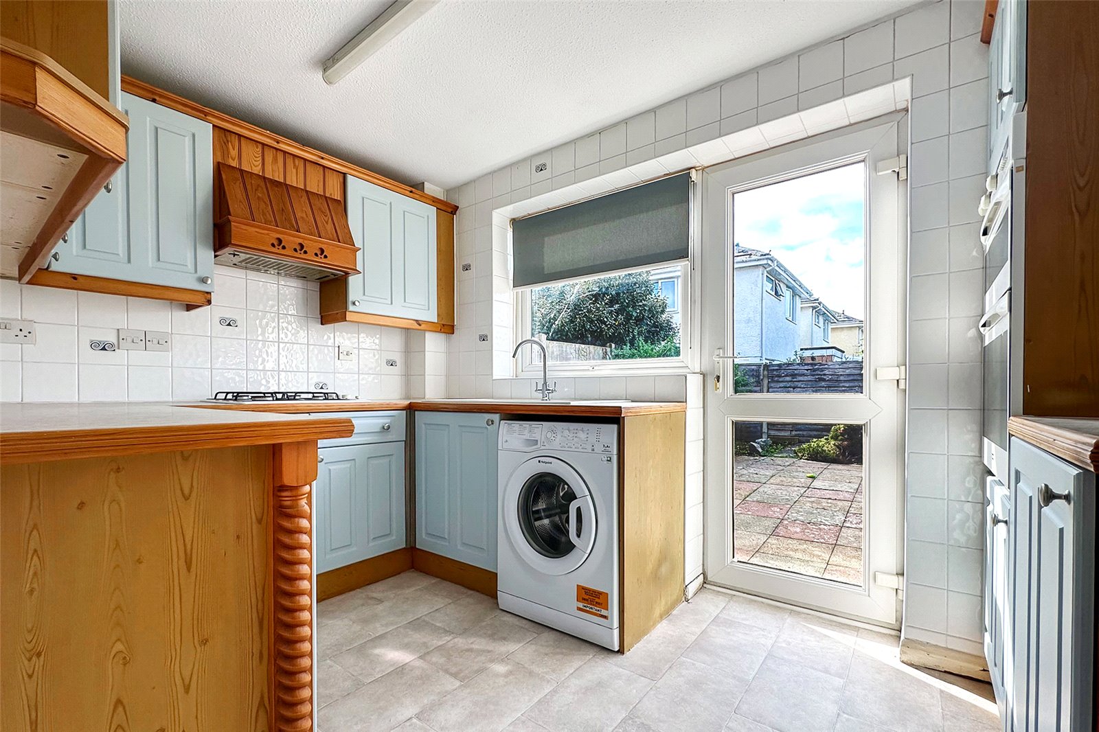 Upon entering, you're welcomed through an enclosed porch that leads into the main living area. Thanks to its east-west orientation, the living room is bathed in natural light throughout the day, creating an uplifting and airy atmosphere. The kitchen provides ample storage and workspace, though those with a preference for contemporary styling may wish to update the finishes.