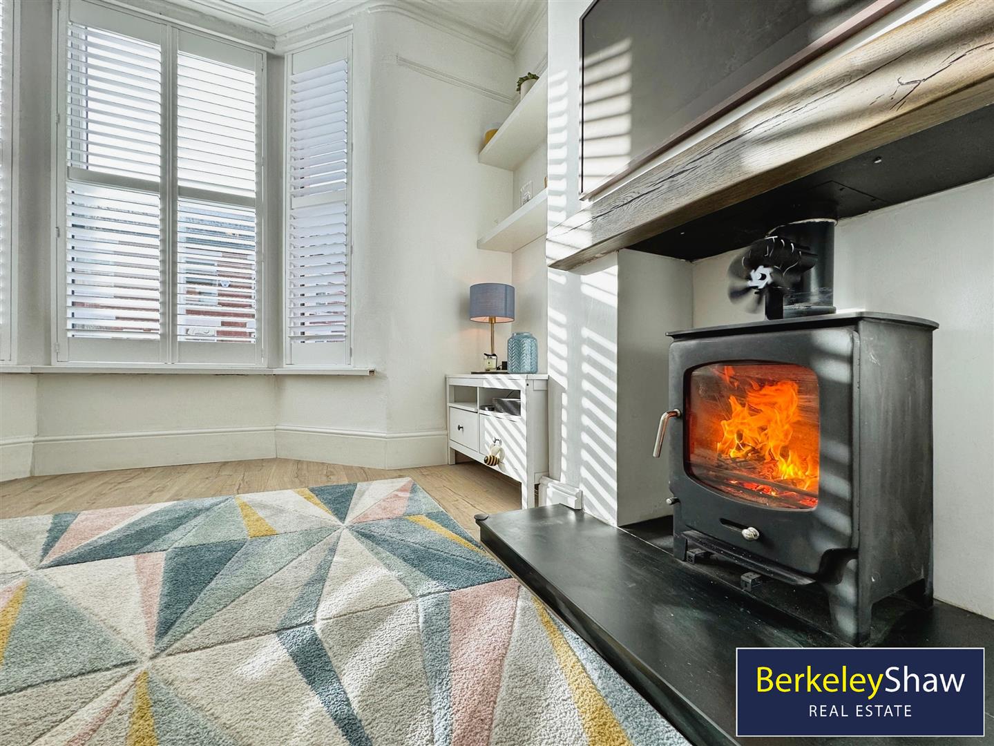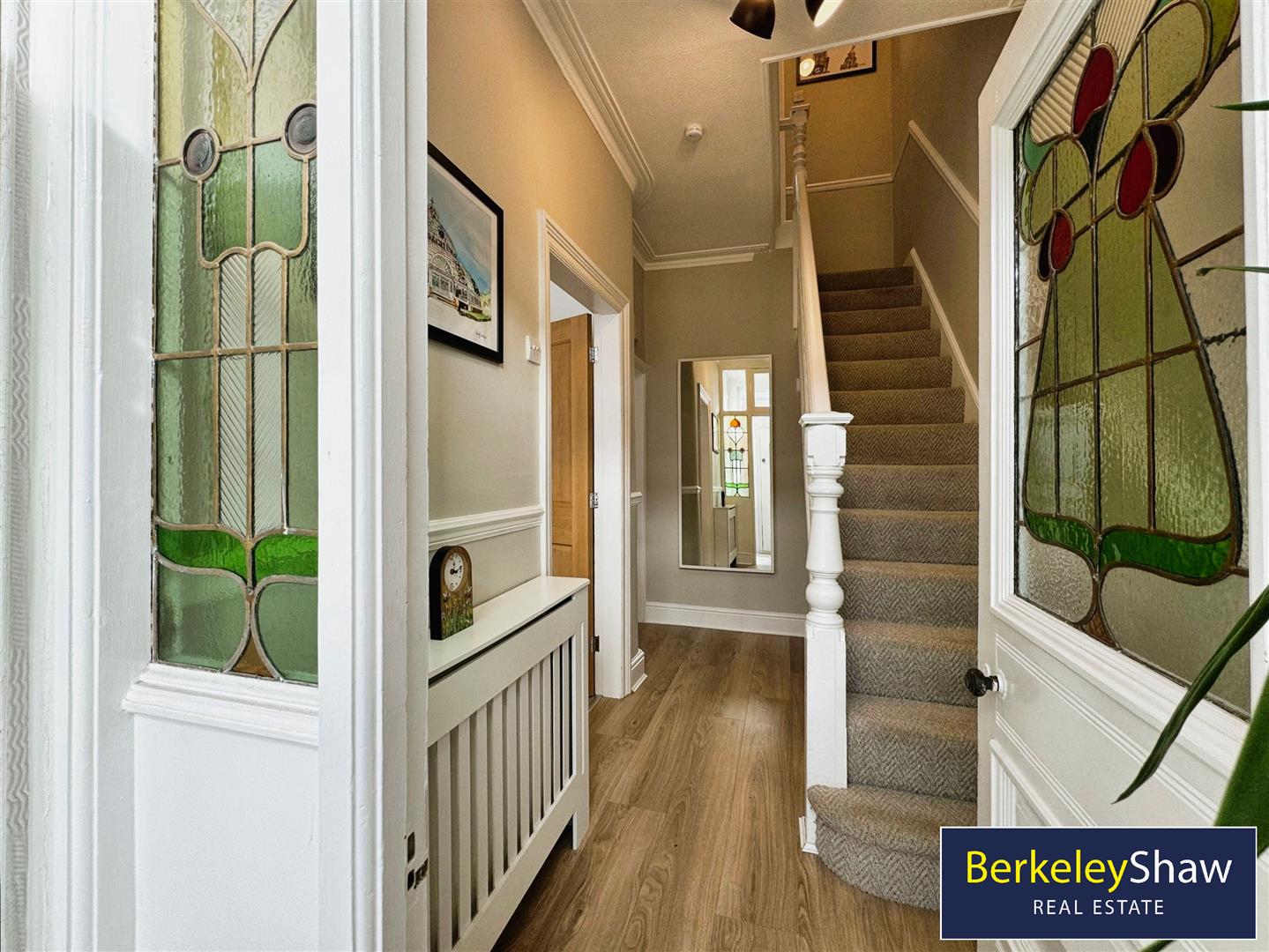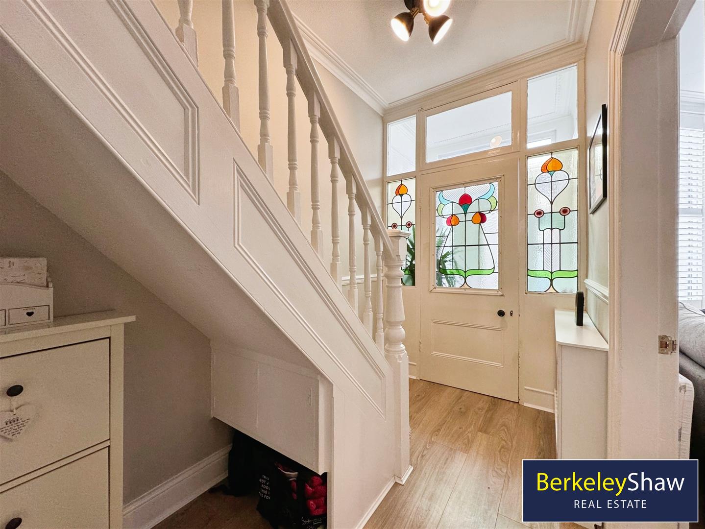 Step into the bright and airy vestibule, where you're greeted by a stunning set of stained glass windows and a door that leads into a spacious, welcoming hallway. To the left, the warm and inviting living room provides the perfect space to relax, featuring a log burner, built-in shelving, shutter blinds, and a large bay window that fills the room with natural light.