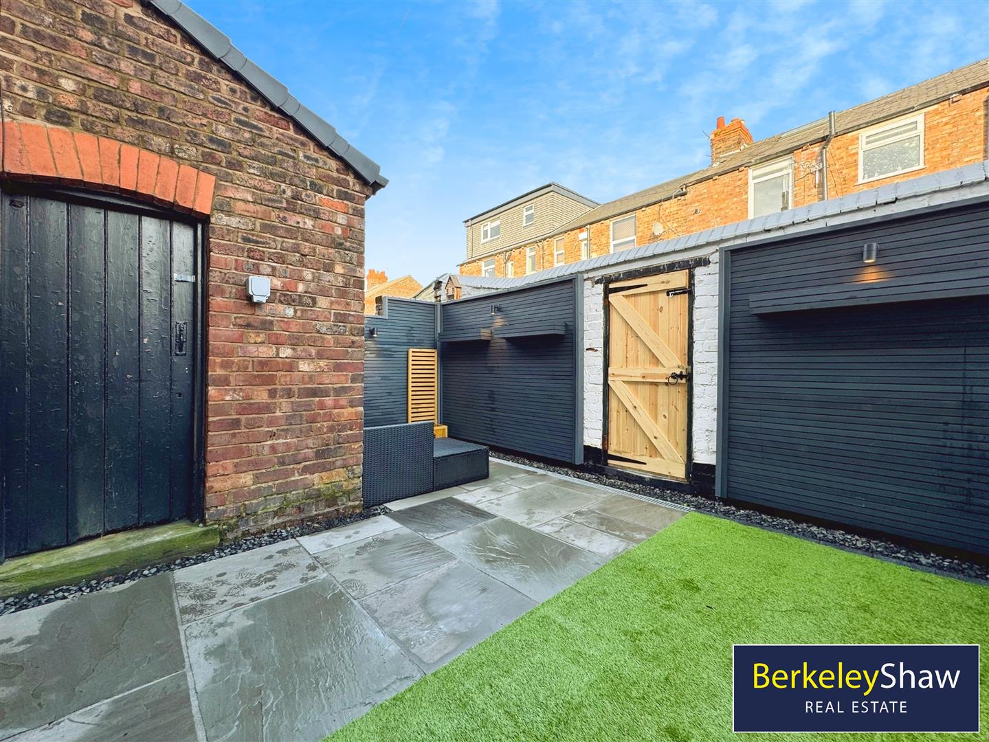 The rear yard offers a paved seating area, artificial turf, and gated access to the rear alley, making it both low-maintenance and practical.