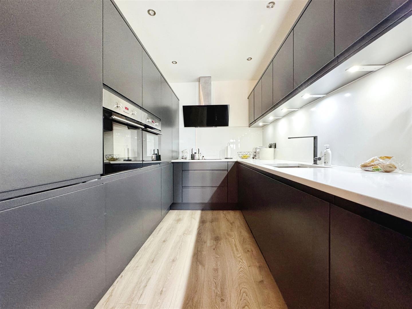 Kitchen - Range of wall & base units, quartz work tops, stainless steel sink with mixer tap, 2 x ovens, induction hob, open aspect to living/dining space & extractor hood.