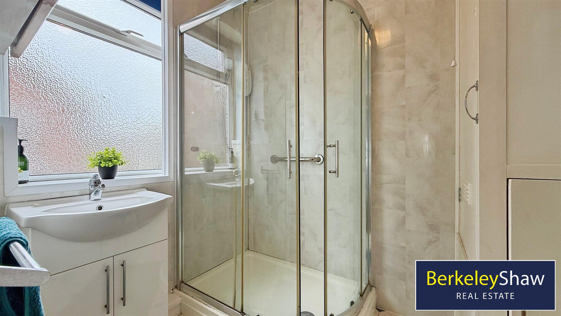 Shower Room - 6'7" x 5'5" - The shower room is a modern and practical space measuring 2.0 by 1.6 metres (6'7" x 5'5"), fitted with a corner shower enclosure, wash basin and tiled flooring. A window provides natural light and ventilation.
