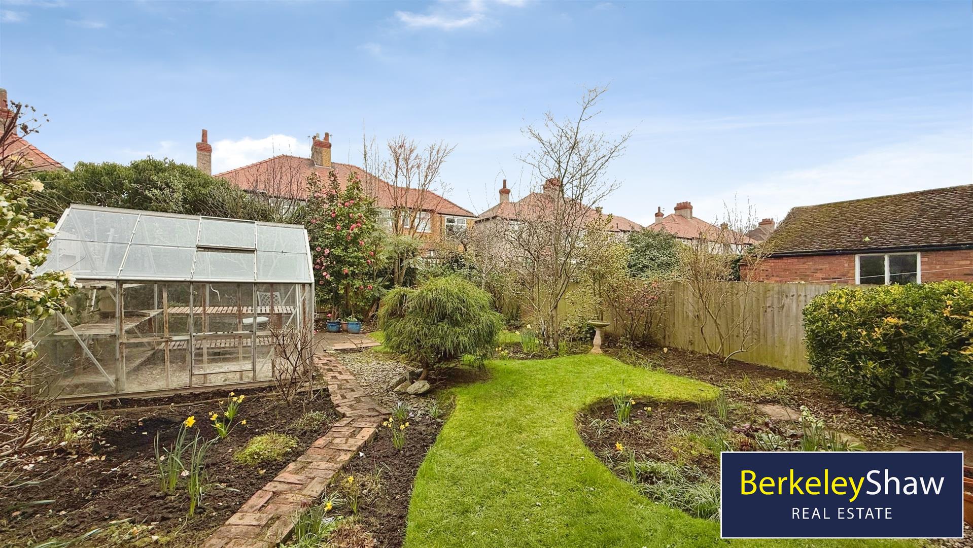 Rear Garden - The rear garden extends beautifully from the back of the house, featuring a lawn bordered by planting beds, mature shrubs, and a greenhouse. It offers a peaceful outdoor space for relaxation, gardening or play, enclosed by fencing for privacy and security.