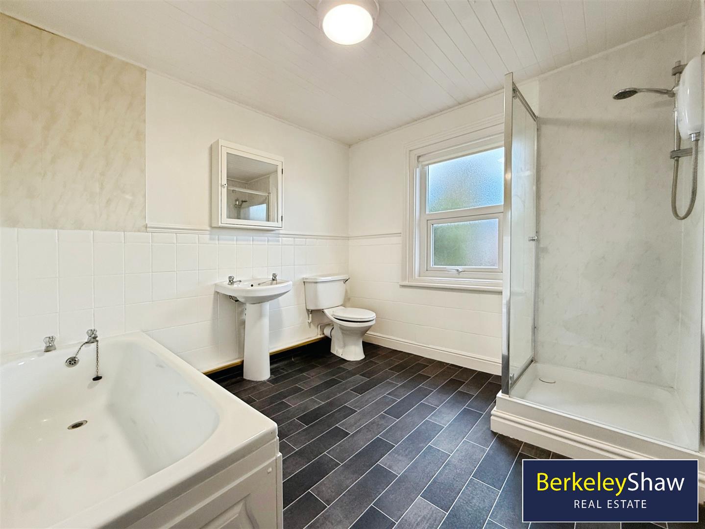 Bathroom - 2.80 x 2.70 (9'2" x 8'10") - Full-size panel bath, cubicle shower, Pedestal sink and WC, window to rear aspect, vinyl flooring, part-tiled walls.