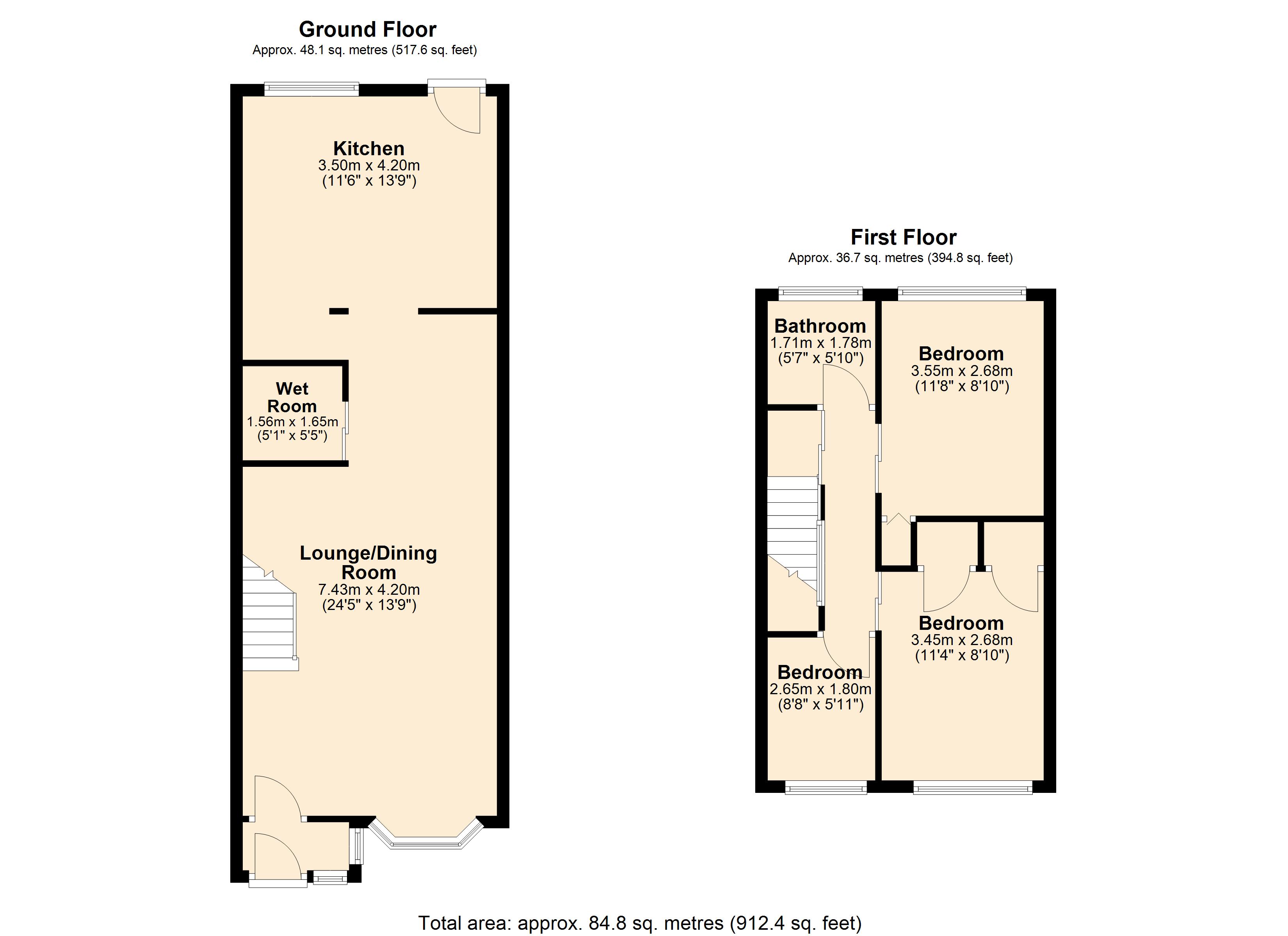 To the first floor, the property boasts three good-sized bedrooms. The main bedroom features built-in wardrobes, while the rear bedroom also benefits from fitted wardrobes, ensuring plenty of storage throughout. A family bathroom completes the accommodation, fitted with a bath and overhead shower.