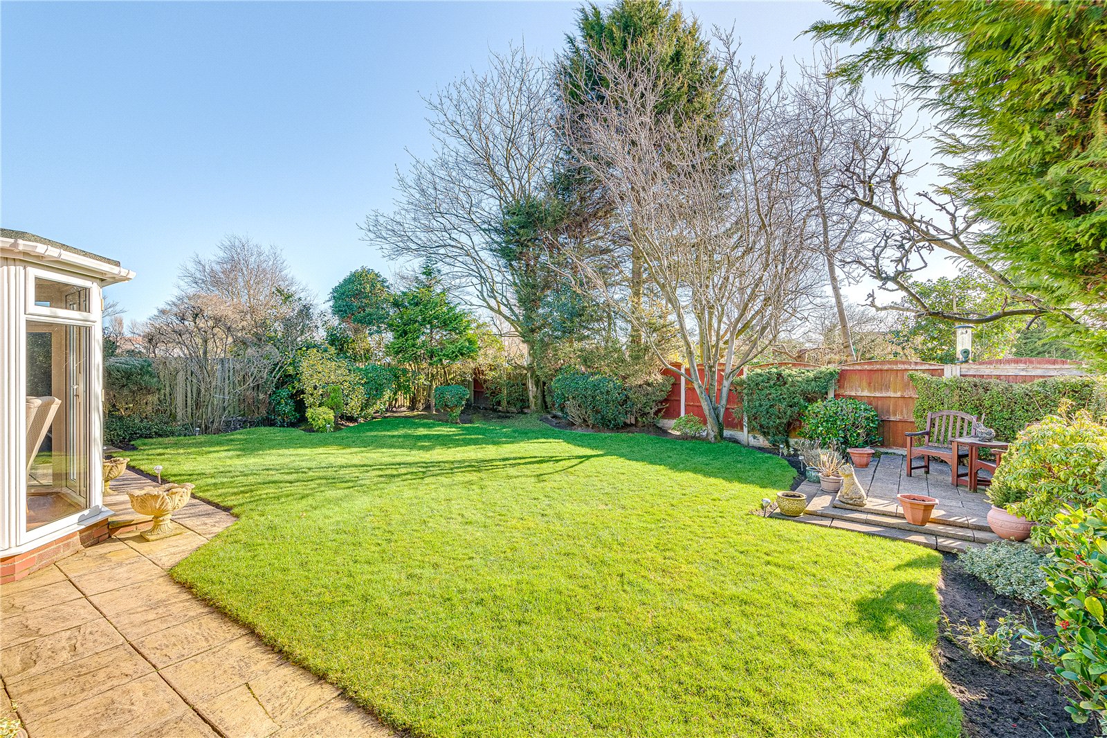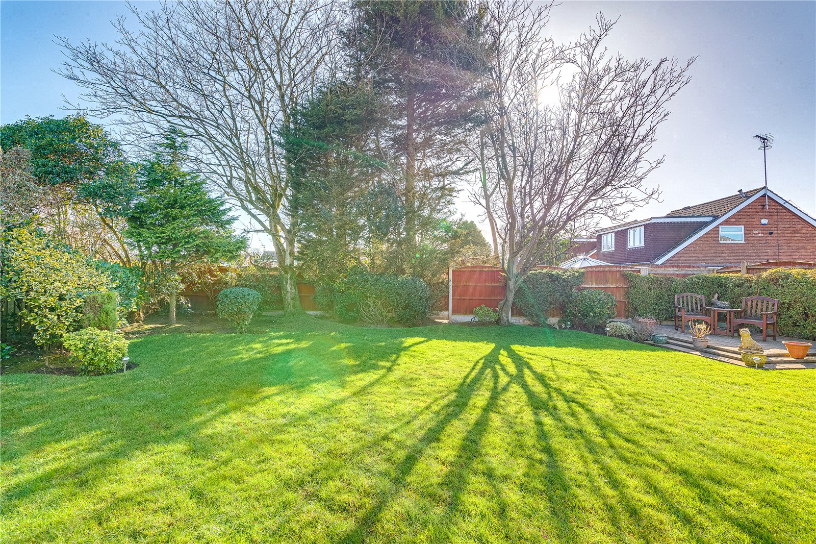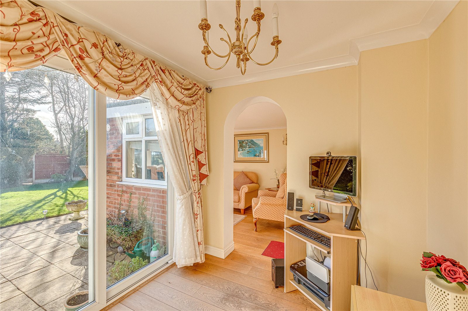 Occupying a generous corner plot, the property benefits from gardens to the front, side, and rear. The front elevation provides ample space for plants and landscaping, while a paved section offers convenient off-street parking and access to the garage. The south facing rear garden, which is not directly overlooked, can be accessed seamlessly from both the dining room via French doors and the study via sliding doors, creating a desirable indoor-outdoor living experience. The outdoor space is ideal for families, featuring both paved and lawned sections and the sun floods the garden from morning to evening.