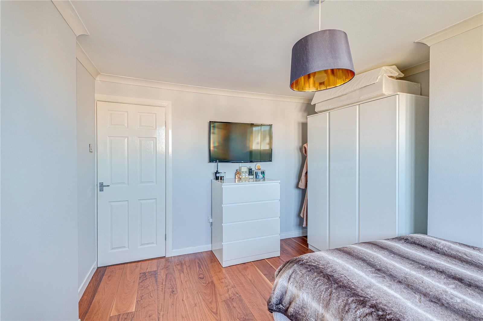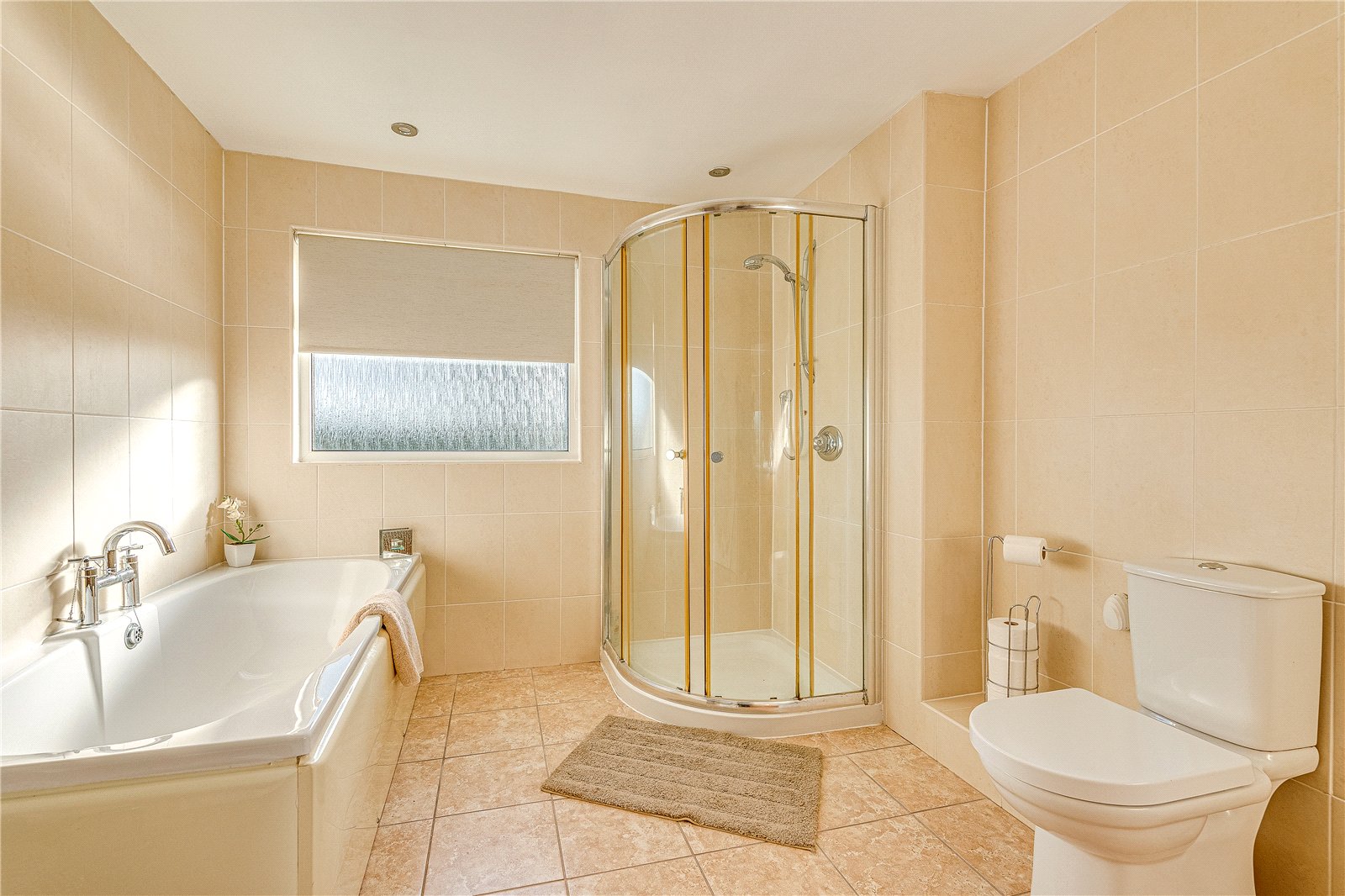 Upstairs, the first floor comprises three well-proportioned bedrooms. The primary bedroom boasts impressive built-in furniture, offering ample storage. The family bathroom has been thoughtfully designed with young families in mind, featuring a bath, a separate shower cubicle, a toilet, and a sink with a stylish vanity unit.