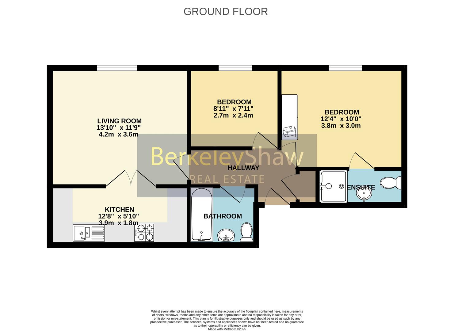 Accessed via a well-maintained communal entrance hall with stairs to the upper floors, the apartment welcomes you into an inviting entrance hallway with a handy storage cupboard. The bright and spacious living/dining room provides an elegant space to relax or entertain, featuring double doors leading into a newly fitted kitchen with sleek cabinetry and a full range of integrated appliances. The master bedroom is a true retreat, complete with fitted wardrobes and a beautiful en-suite shower room. A second bedroom and a modern three-piece bathroom complete the layout.